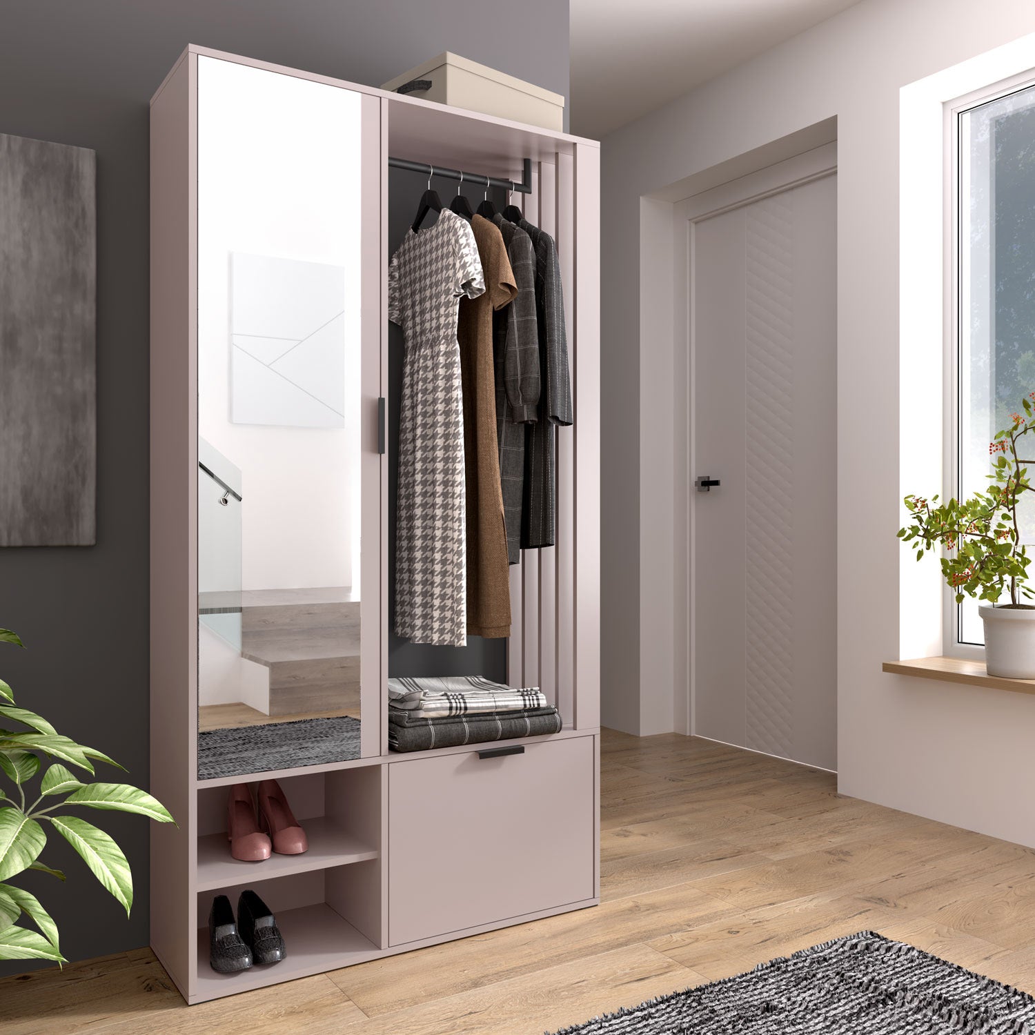 - Boczny moduł z drążkiem – idealny na kurtki, płaszcze i akcesoria