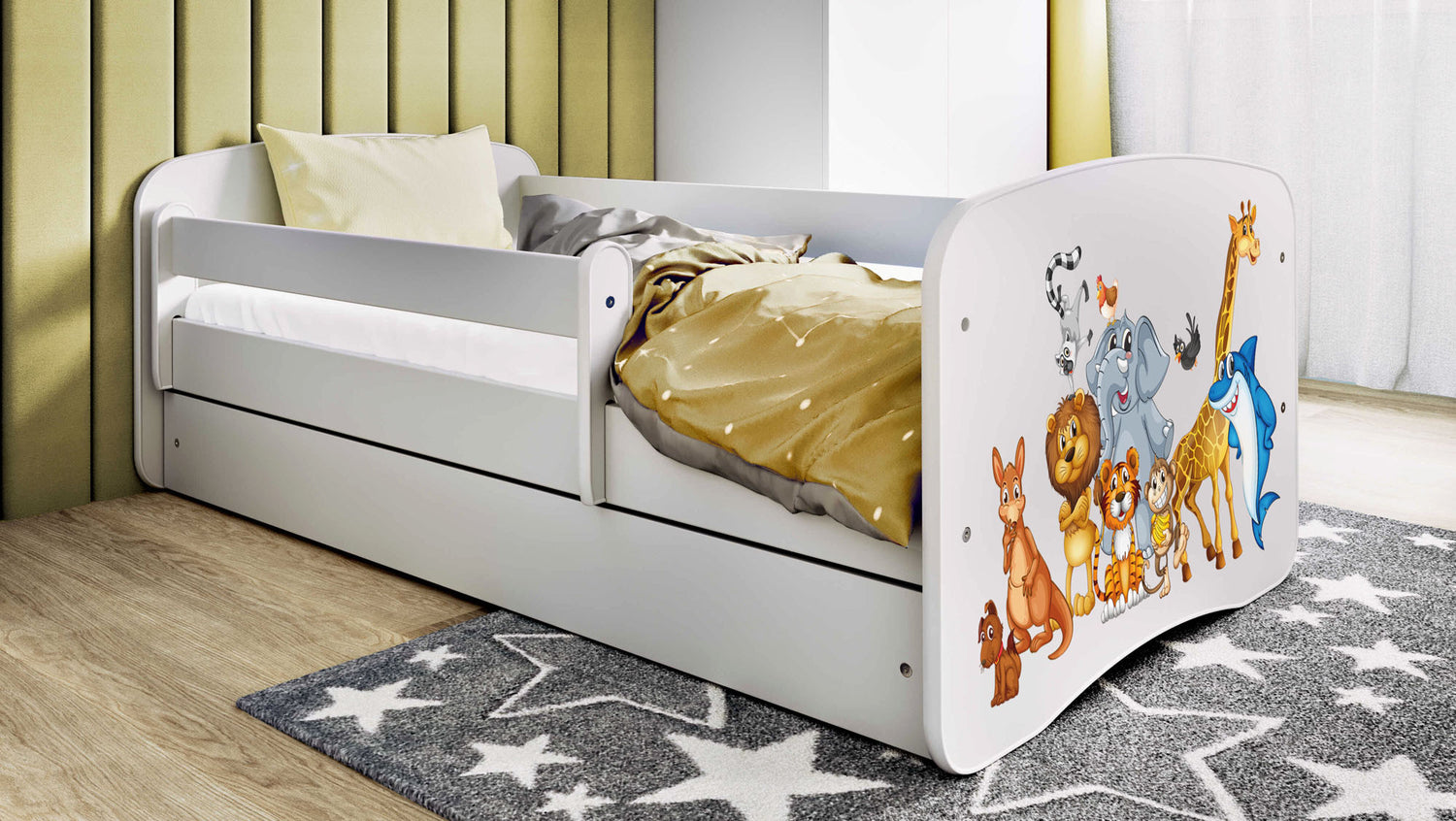 KOMPLETNY ZESTAW Z MATERACEM I BARIERKĄ – Łóżko dziecięce dostarczane ze stabilnym stelażem z drewna sosnowego, 8 cm materacem piankowym z zdejmowanym, pralnym pokrowcem oraz boczną barierką ochronną. Idealne dla chłopców i dziewczynek – bezpieczne, wygodne i przytulne!