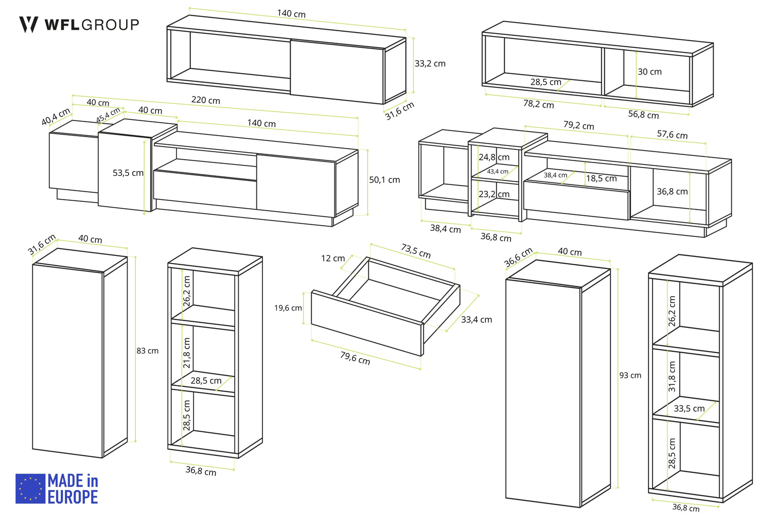 Zestaw składa się z pojemnej szafki RTV z przepustami kablowymi, dwóch wiszących szafek oraz półki ściennej. Czyste linie, bezuchwytowe fronty z systemem Push-to-Open oraz przemyślany układ brył sprawiają, że kolekcja świetnie dopełni nowoczesny salon.