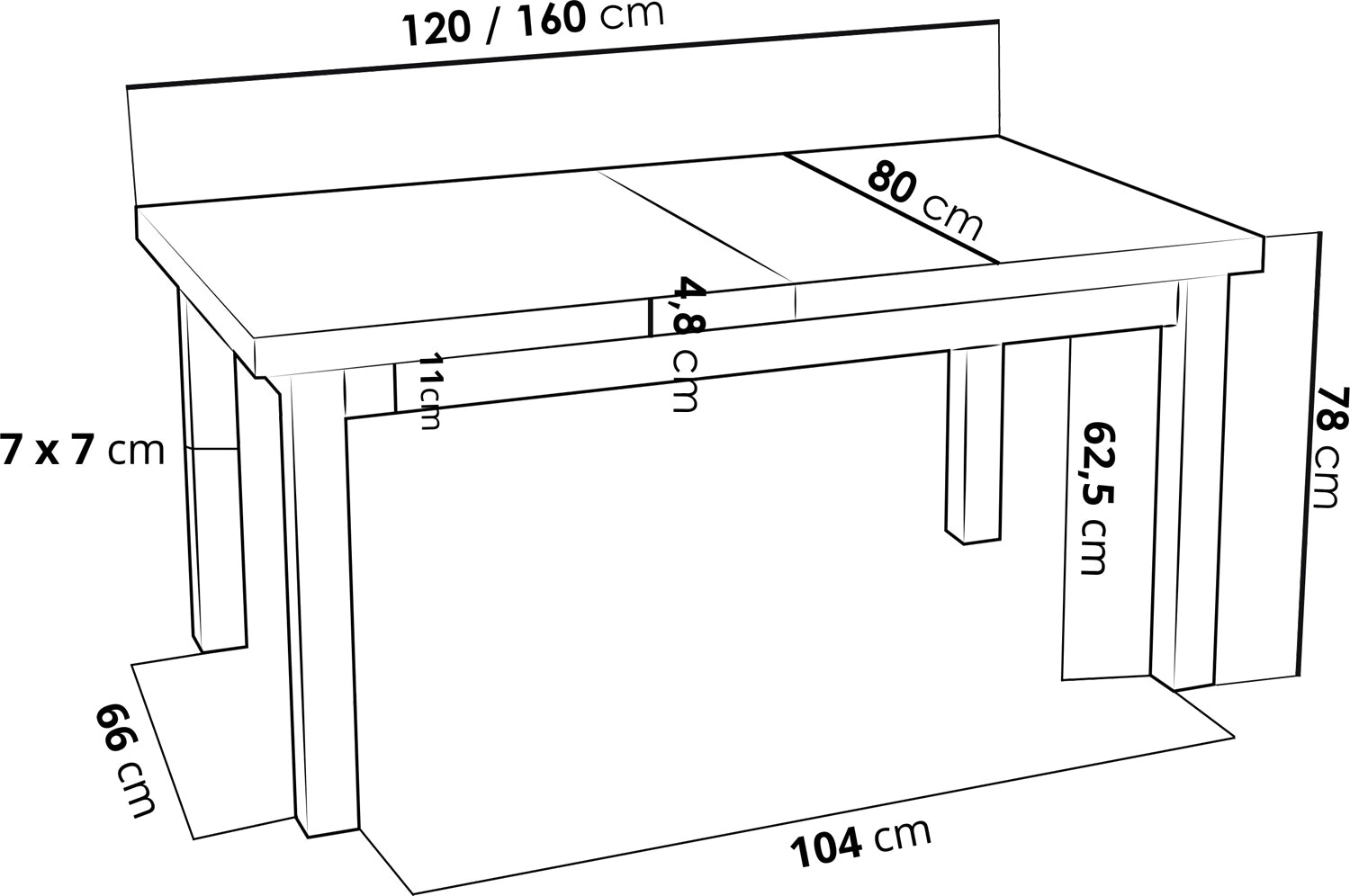 120 x 80 cm, wysokość 75 cm, blat rozkładany do 160 cm (1x płyta przedłużająca 40 cm)