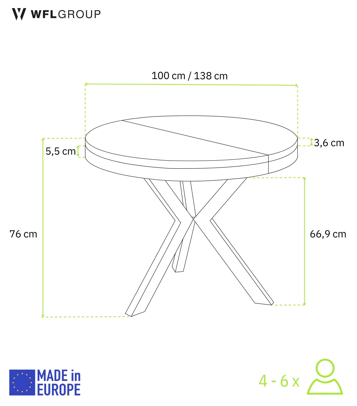 • Średnica: 100 cm, Wysokość: 76 cm (blat rozszerzalny do 138 cm)