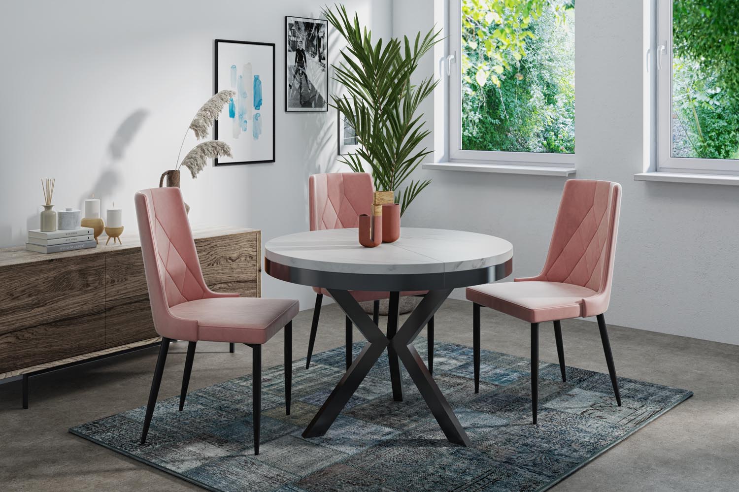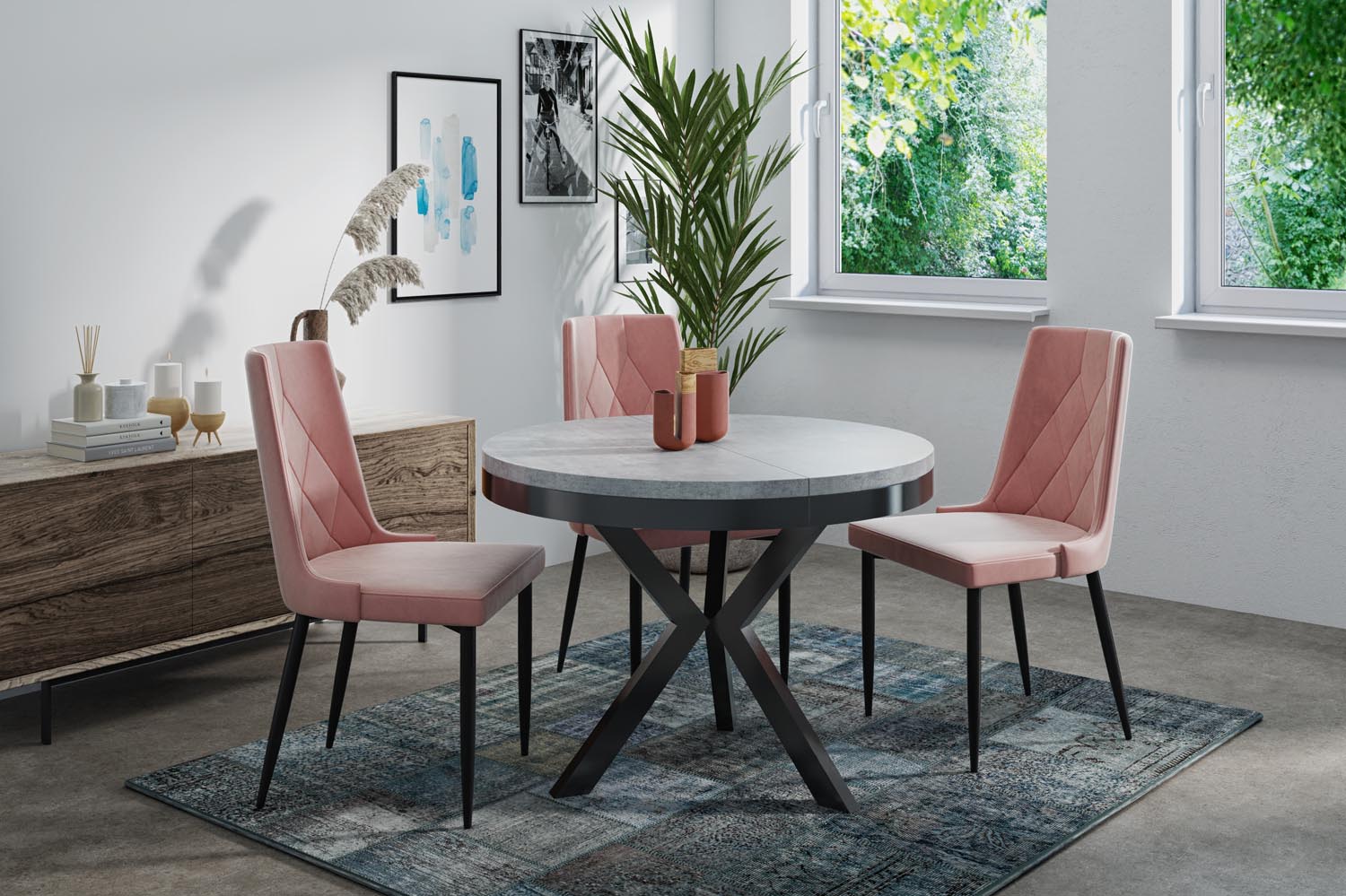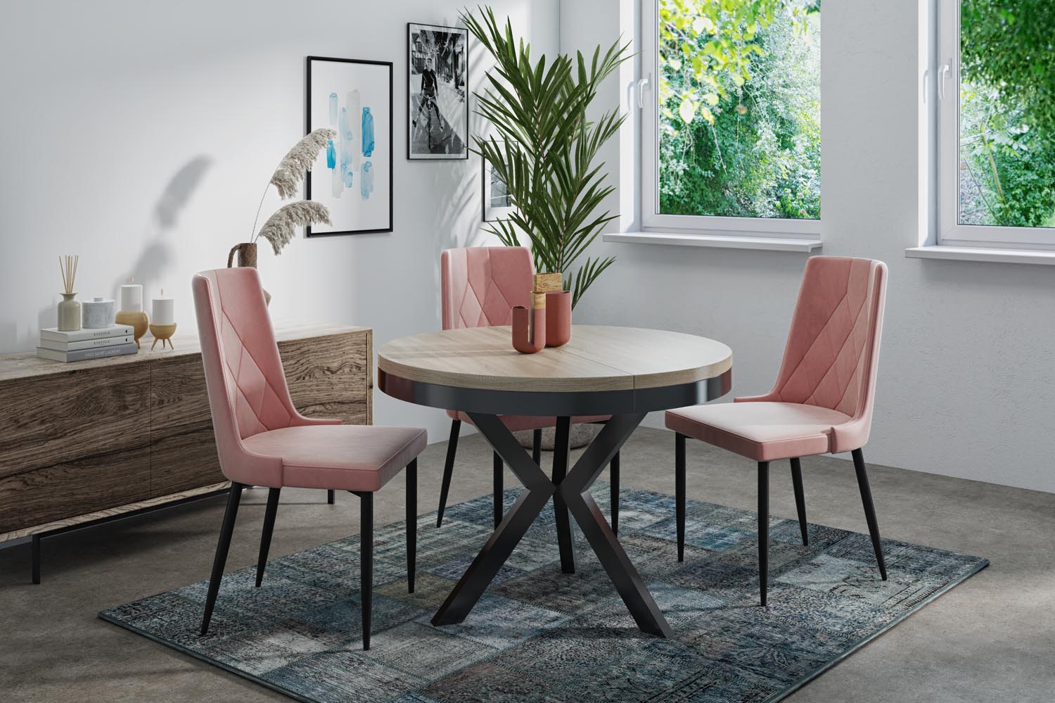 Elegancja i funkcjonalność w jednym Stół Velma łączy nowoczesny design z praktyczną funkcjonalnością. Okrągły kształt i charakterystyczny stelaż w kolorze czarnym tworzą ponadczasowy wygląd, który harmonijnie wpasowuje się w Twój dom.