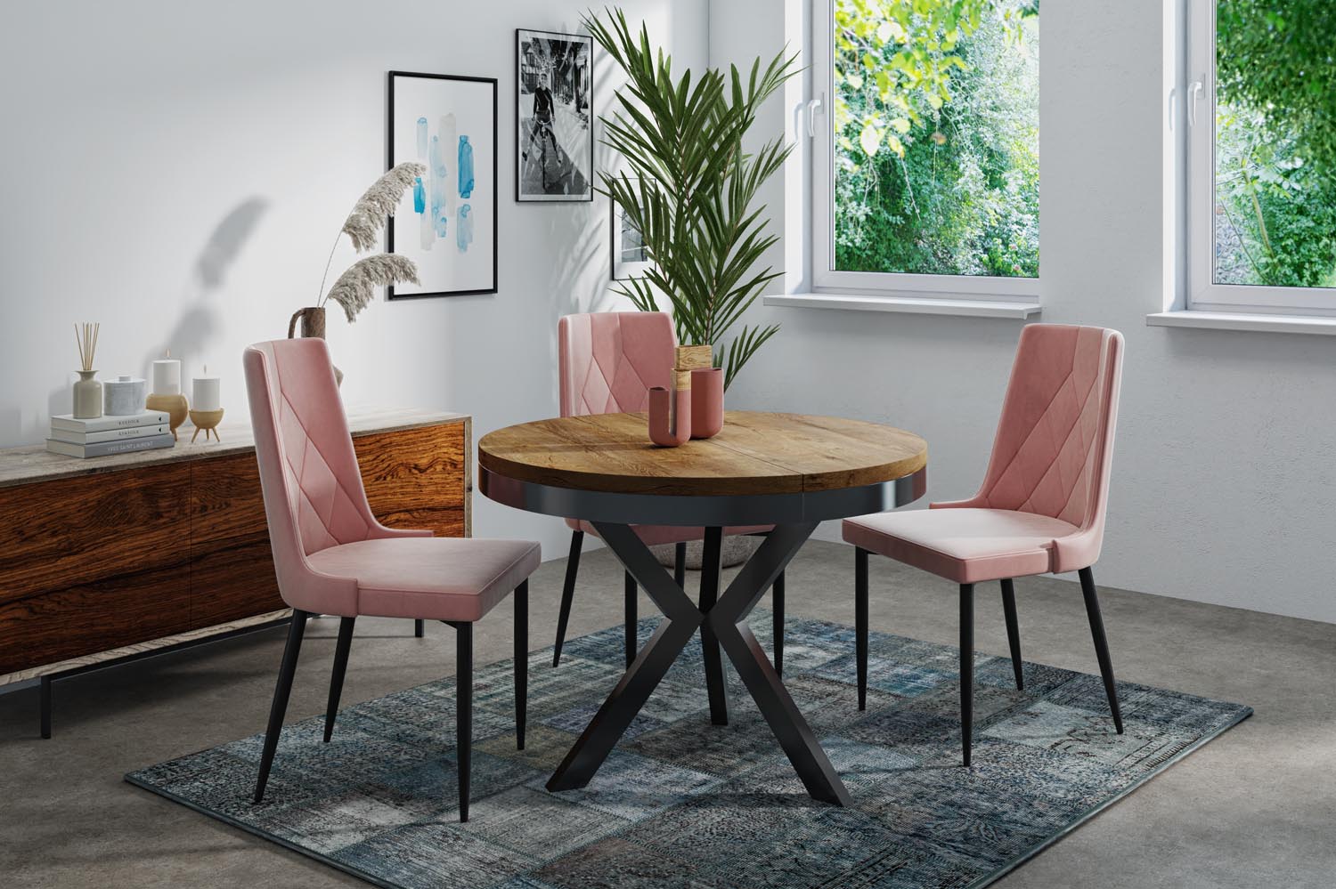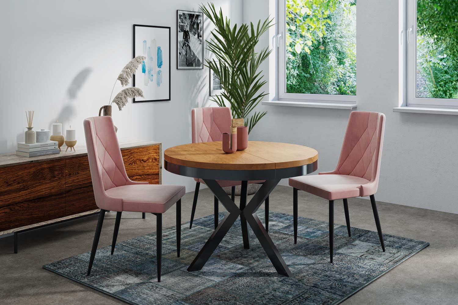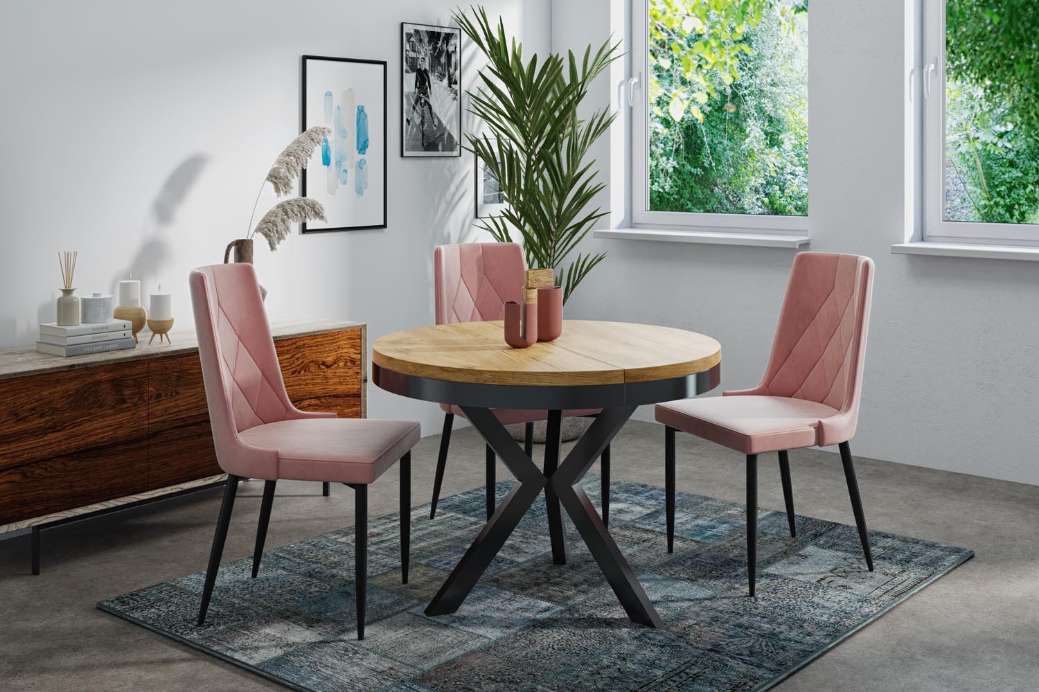 Elegancja i funkcjonalność w jednym Stół Velma łączy nowoczesny design z praktyczną funkcjonalnością. Okrągły kształt i charakterystyczny stelaż w kolorze czarnym tworzą ponadczasowy wygląd, który harmonijnie wpasowuje się w Twój dom.