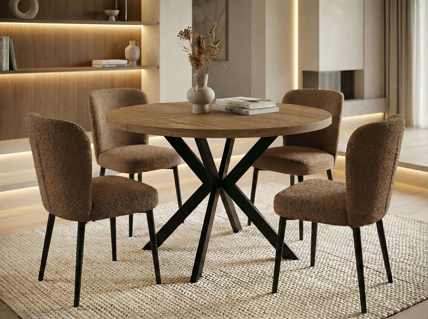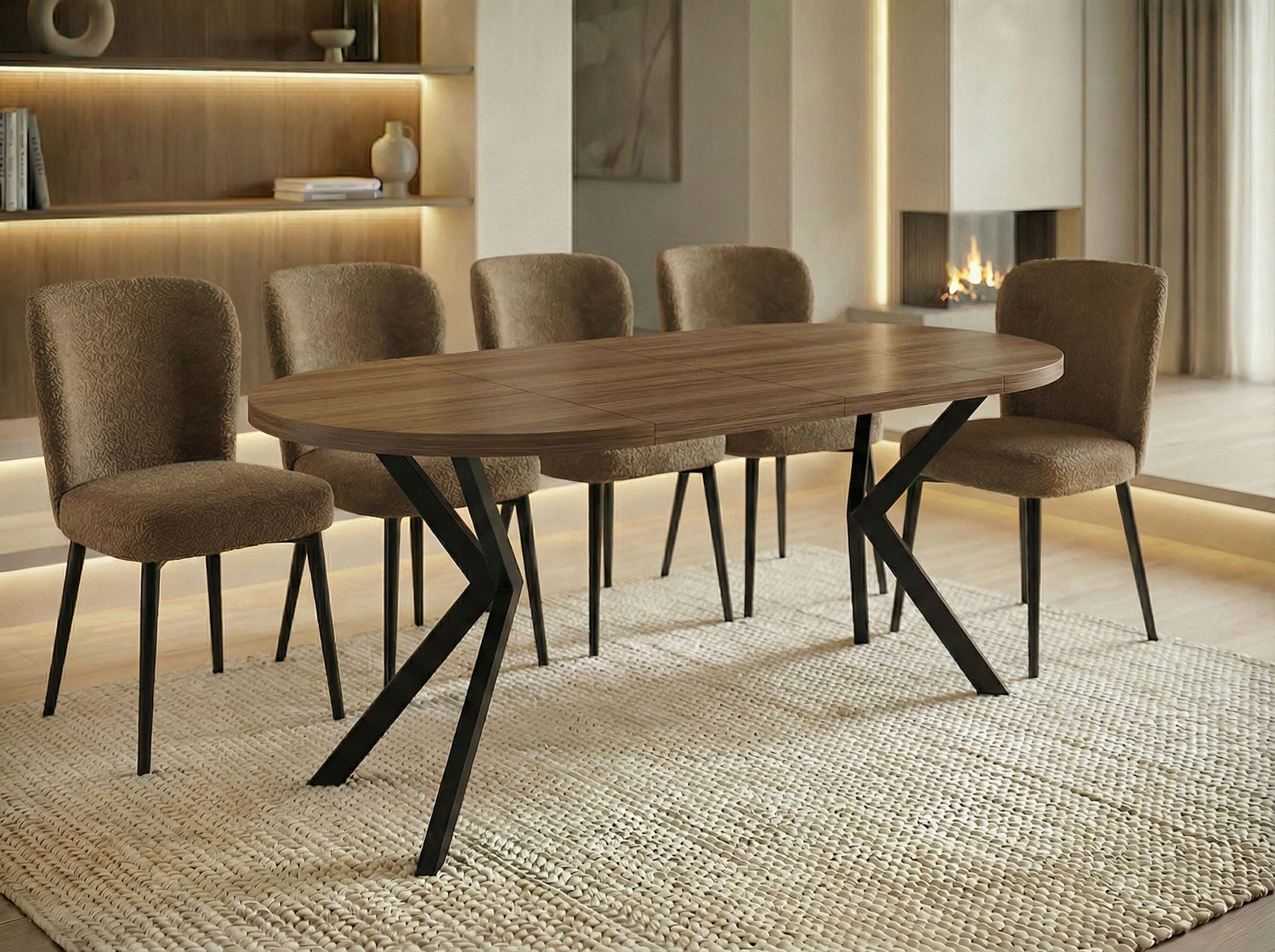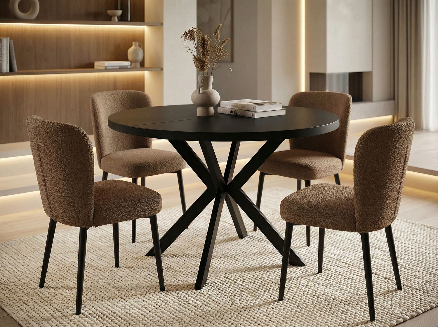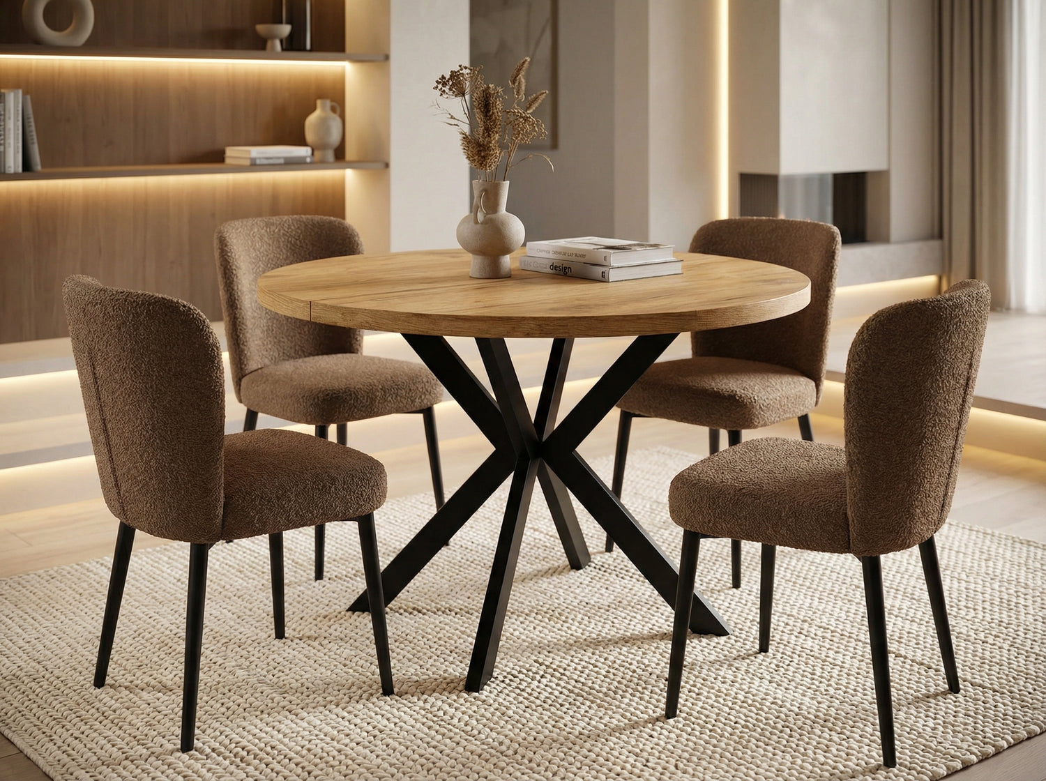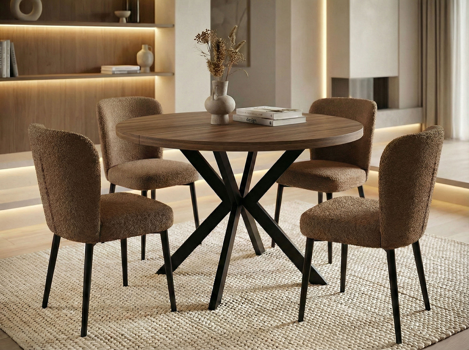 Stół jadalniany Valeo łączy nowoczesny design z praktycznymi rozwiązaniami. Okrągły blat oraz charakterystyczny stelaż w kształcie X tworzą ponadczasową formę, która świetnie wpisuje się zarówno w nowoczesne, jak i bardziej klasyczne wnętrza.