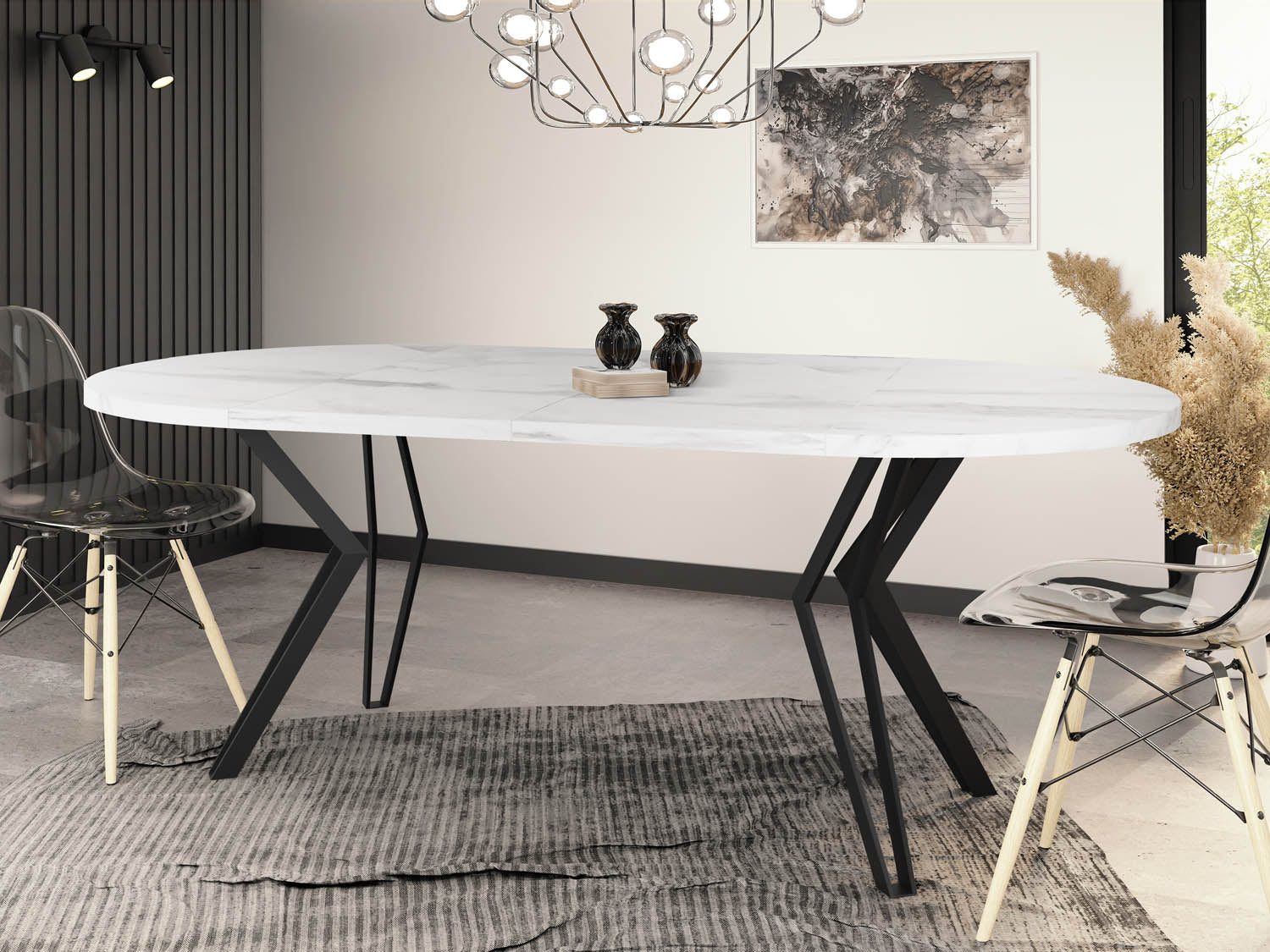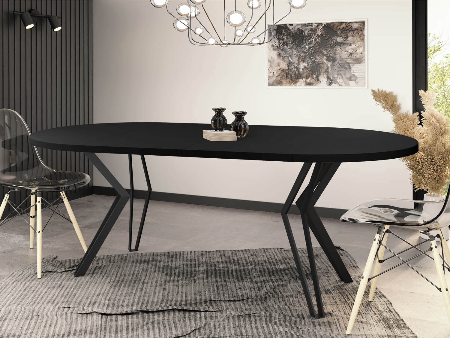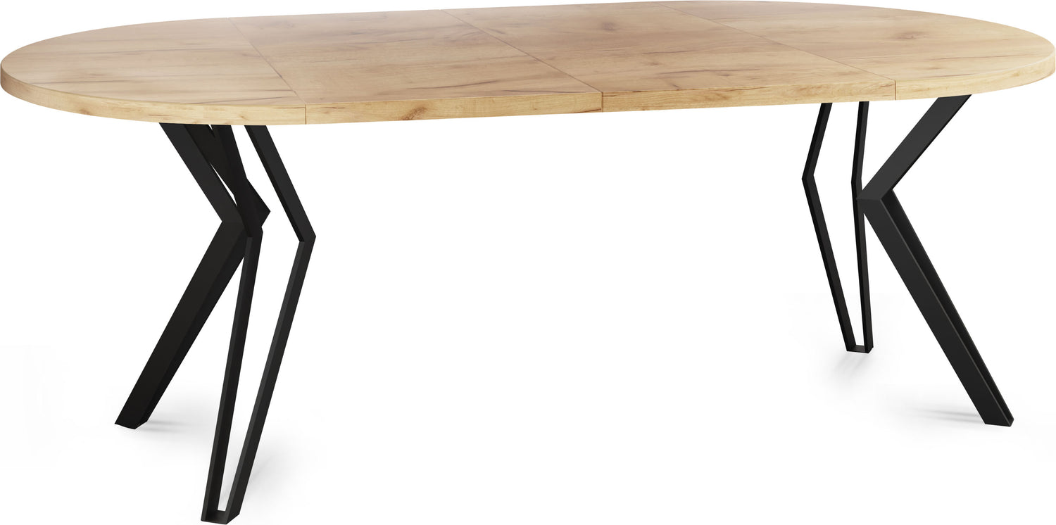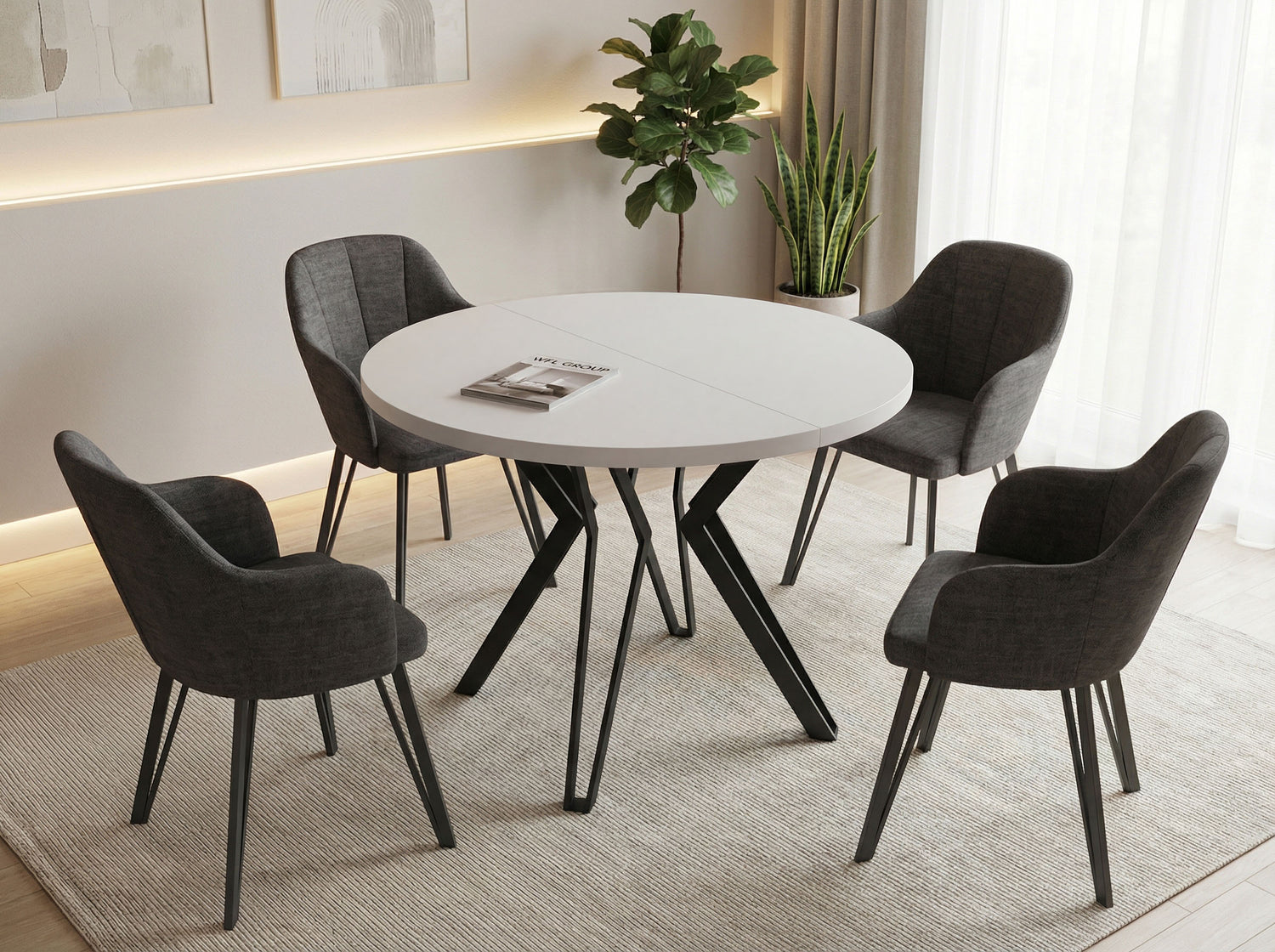 Model Ravena dostępny jest w dwóch wariantach średnicy: 100 cm oraz 120 cm. Każdą wersję można wygodnie powiększyć za pomocą dwóch wkładek, uzyskując odpowiednio 176 cm lub 196 cm długości – idealne rozwiązanie na większe spotkania lub rodzinne obiady.