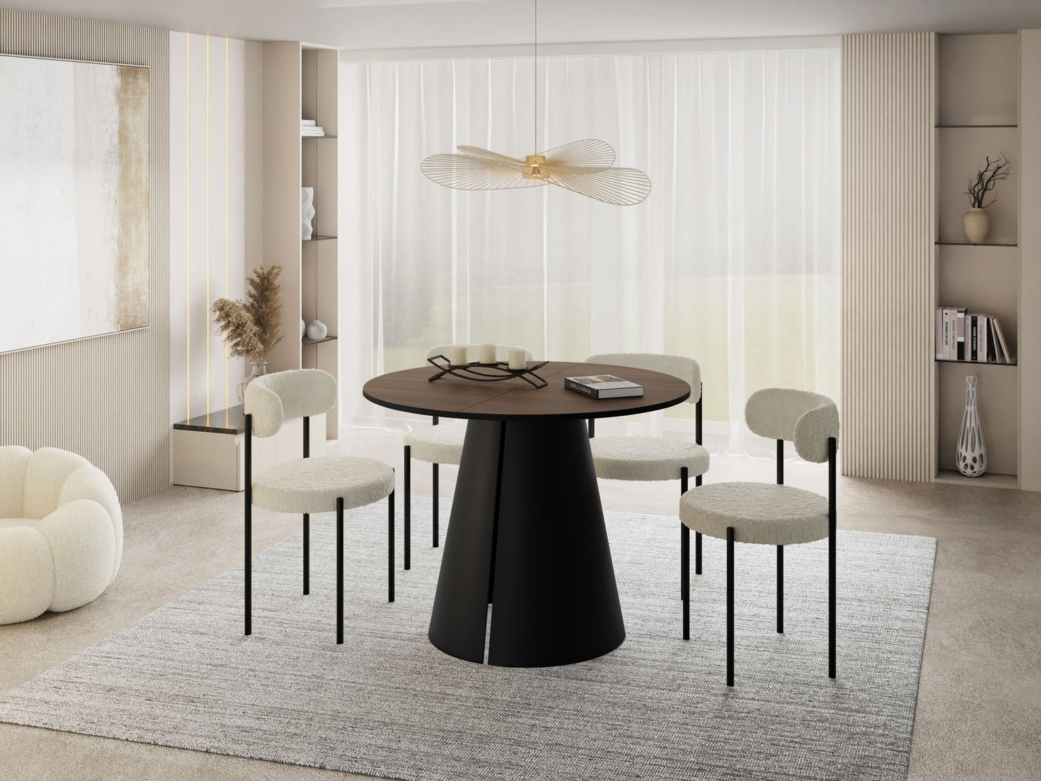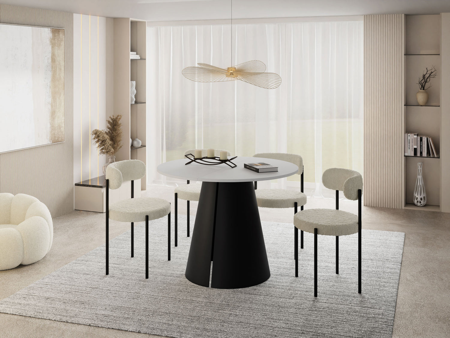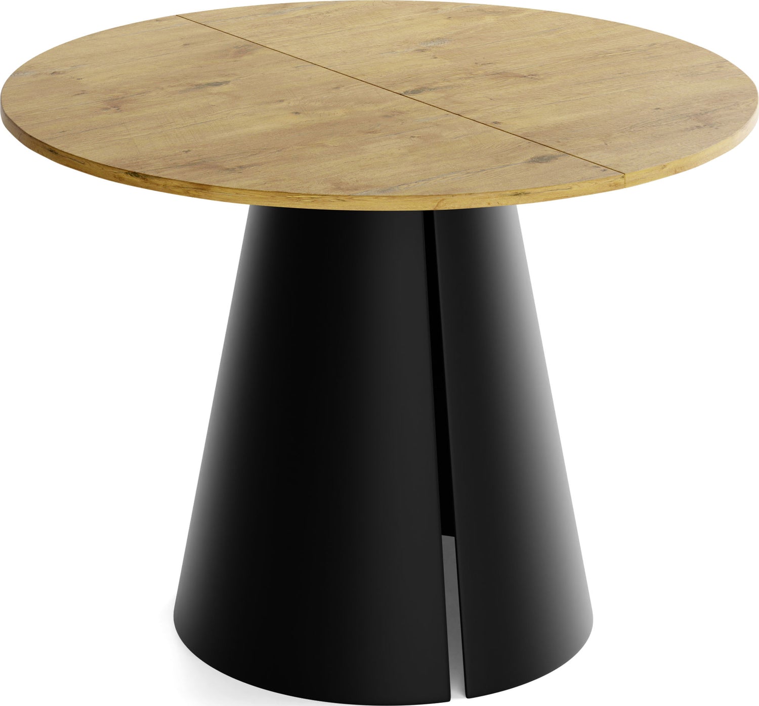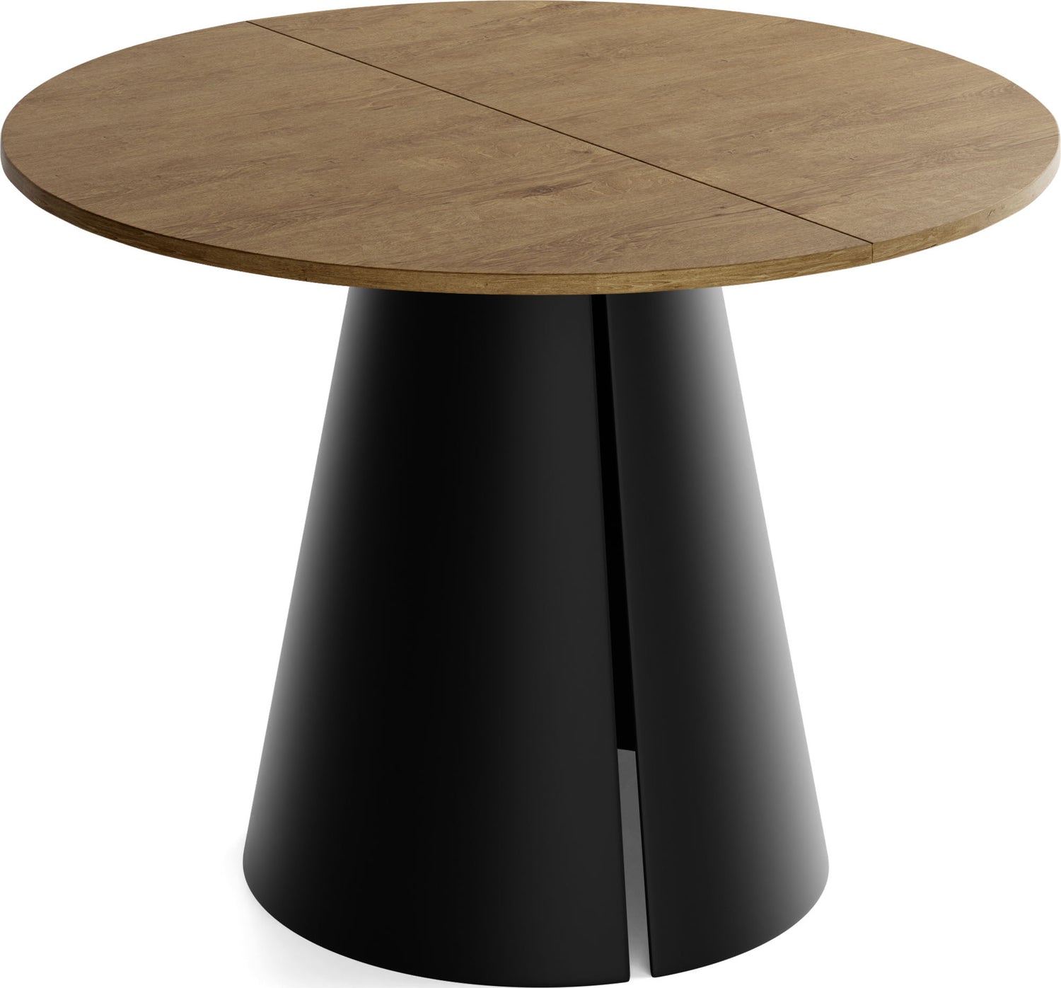 Stół jadalniany Lamio łączy nowoczesny, wyrazisty design z praktyczną funkcją rozkładania. Okrągły blat można w mgnieniu oka powiększyć – świetnie sprawdzi się podczas spotkań towarzyskich. Masywna, stożkowa metalowa podstawa w kolorze beżowego kaszmiru nadaje stołowi architektoniczną „obecność”, zapewnia dużo miejsca na nogi i jednocześnie gwarantuje najwyższą stabilność.