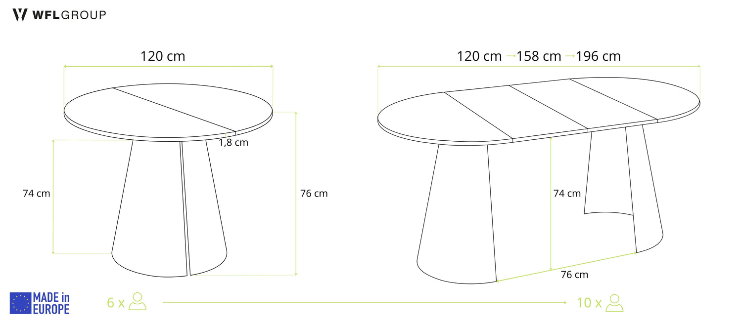 Średnica: 120 cm, wysokość: 76 cm (blat rozkładany do 200 cm)