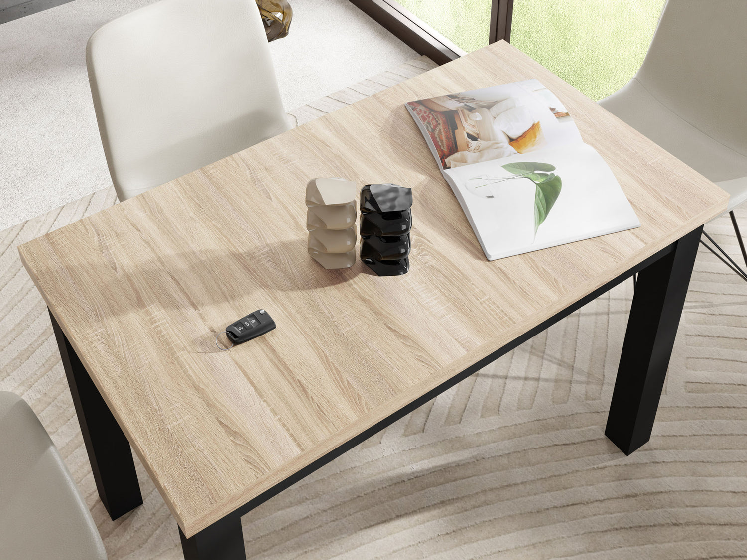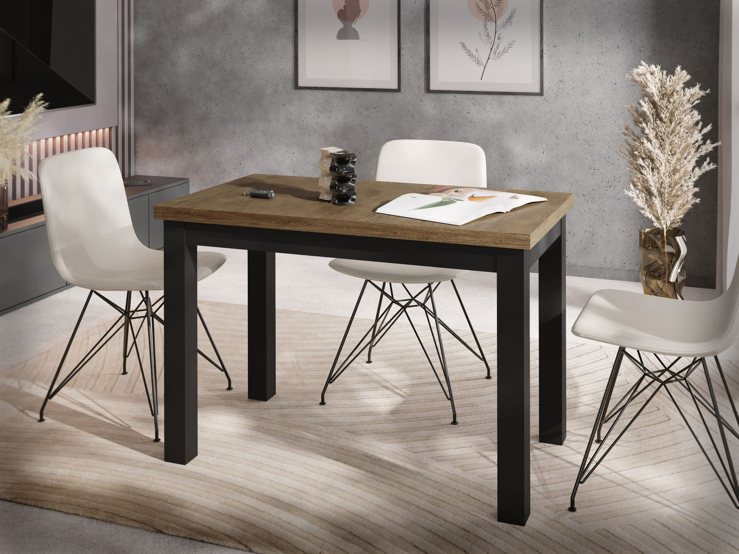 Wnieś nowoczesny styl i praktyczną funkcjonalność do swojej kuchni, jadalni lub biura domowego – dzięki naszemu kompaktowemu Stołowi do Jadalni w modnym designie industrialnym. Kombinacja naturalnego dekoru drewnianego i czystych linii doskonale pasuje do skandynawskich, miejskich lub minimalistycznych koncepcji mieszkaniowych.
