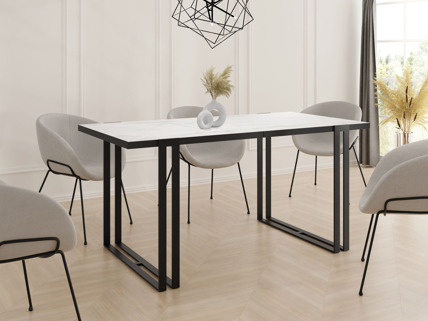 Stół rozkładany Marco łączy minimalistyczny design z klasyczną elegancją, tworząc ponadczasowy element każdej jadalni. Prosta forma, staranne wykończenie oraz możliwość rozkładania sprawiają, że Marco doskonale sprawdza się zarówno na co dzień, jak i podczas większych spotkań. W tej wersji model wyróżnia się czarnym obrzeżem blatu, które dodaje mu nowoczesnego charakteru i podkreśla geometryczną linię stołu.
