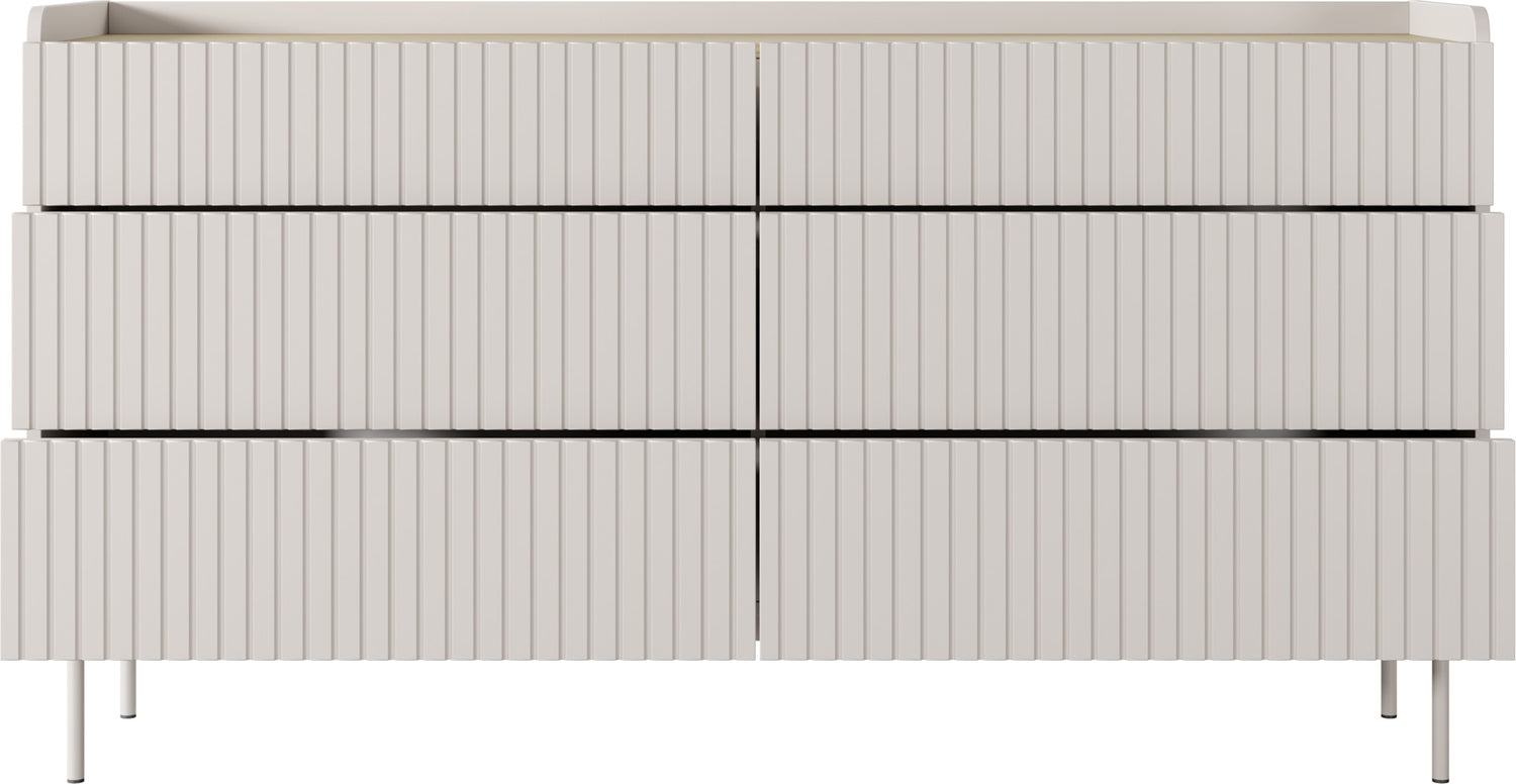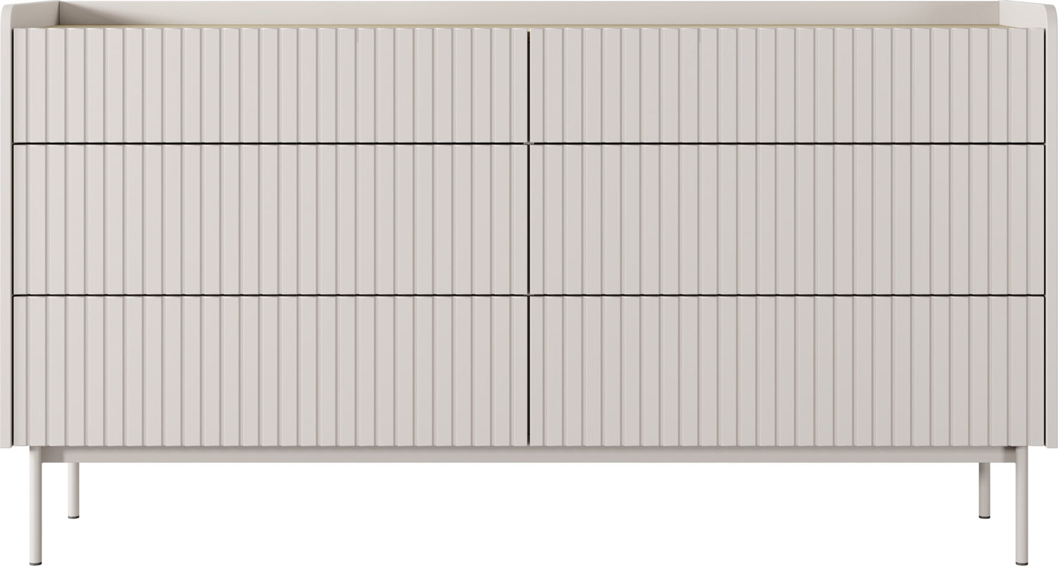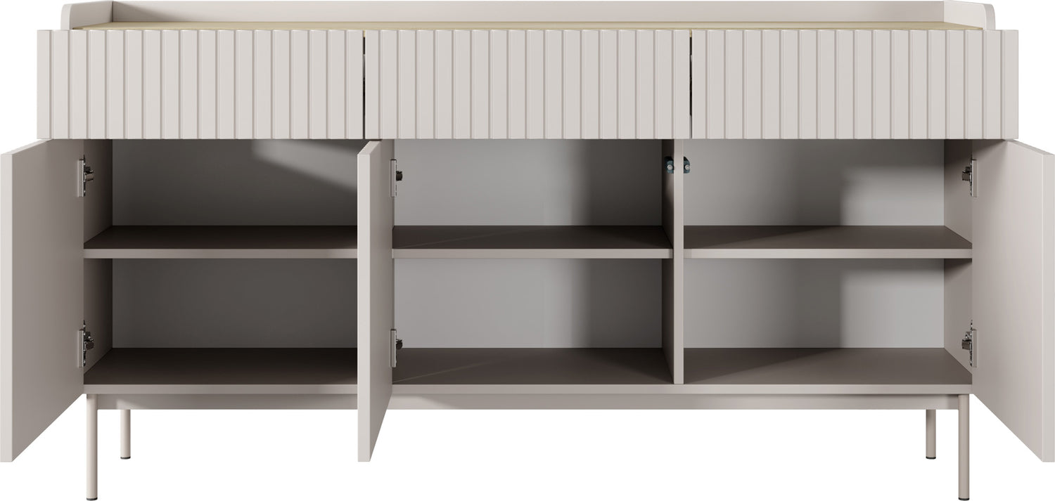 Meble składają się z solidnej, laminowanej płyty wiórowej z frontami MDF w kolorze beżowym. Frezowana powierzchnia wprowadza wizualne akcenty, podczas gdy system Push-to-Open umożliwia wygodne, bezuchwytowe użytkowanie. Lakierowane metalowe nogi w kolorze beżowym podkreślają czysty, skandynawski design.