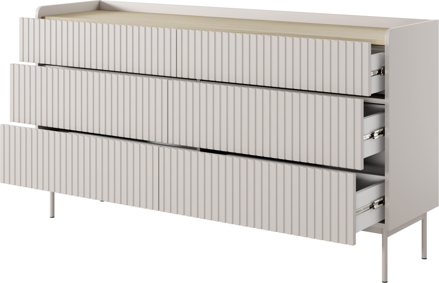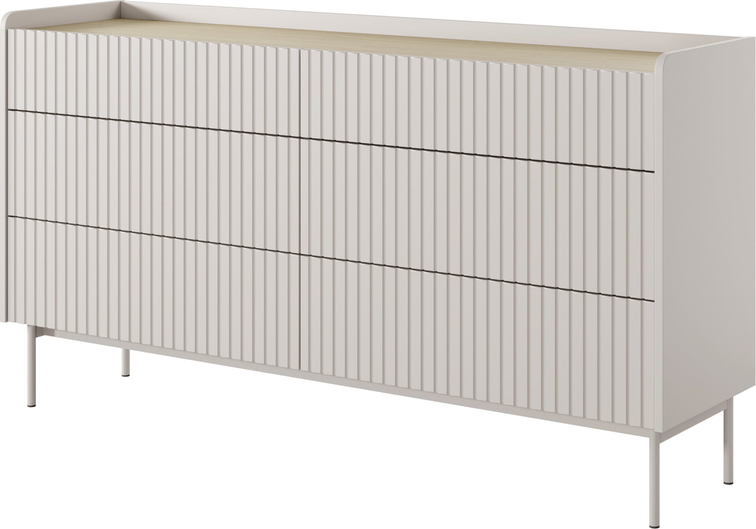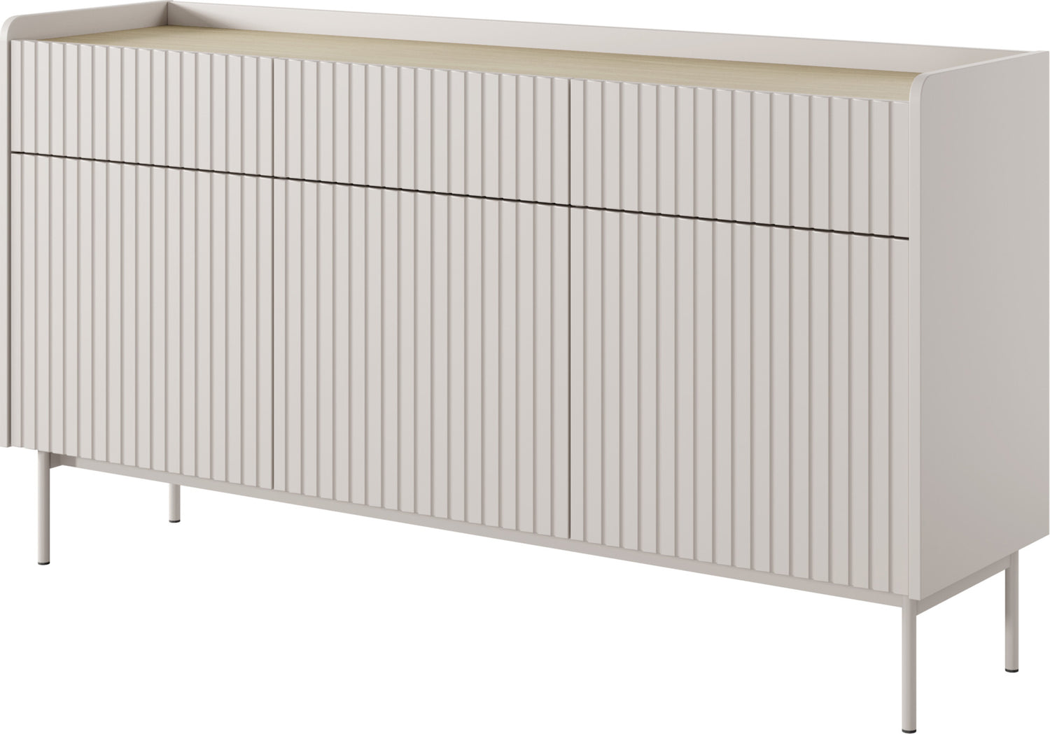Meble składają się z solidnej, laminowanej płyty wiórowej z frontami MDF w kolorze beżowym. Frezowana powierzchnia wprowadza wizualne akcenty, podczas gdy system Push-to-Open umożliwia wygodne, bezuchwytowe użytkowanie. Lakierowane metalowe nogi w kolorze beżowym podkreślają czysty, skandynawski design.