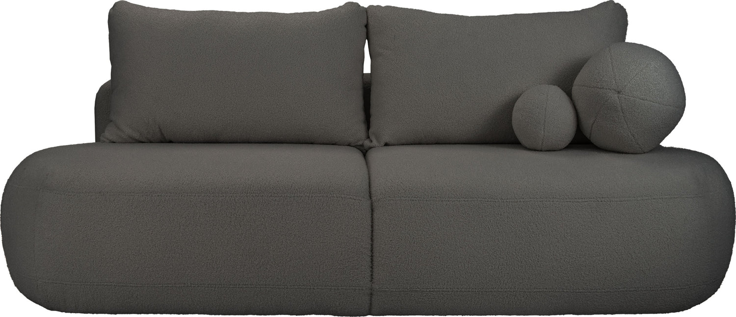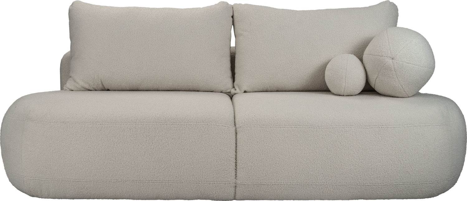 Oferuje wygodną powierzchnię spania o wymiarach 156 × 200 cm – idealną dla gości oraz do codziennego relaksu. Praktyczny pojemnik na pościel (183 × 65 × 23 cm) zapewnia dodatkowe miejsce do przechowywania i świetnie sprawdza się w mniejszych mieszkaniach lub wielofunkcyjnych przestrzeniach. Dwie dekoracyjne poduszki w formie miękkich kul dodają jej unikalnego charakteru. Sofa została wyprodukowana w Polsce, co gwarantuje solidność oraz wysoką jakość.