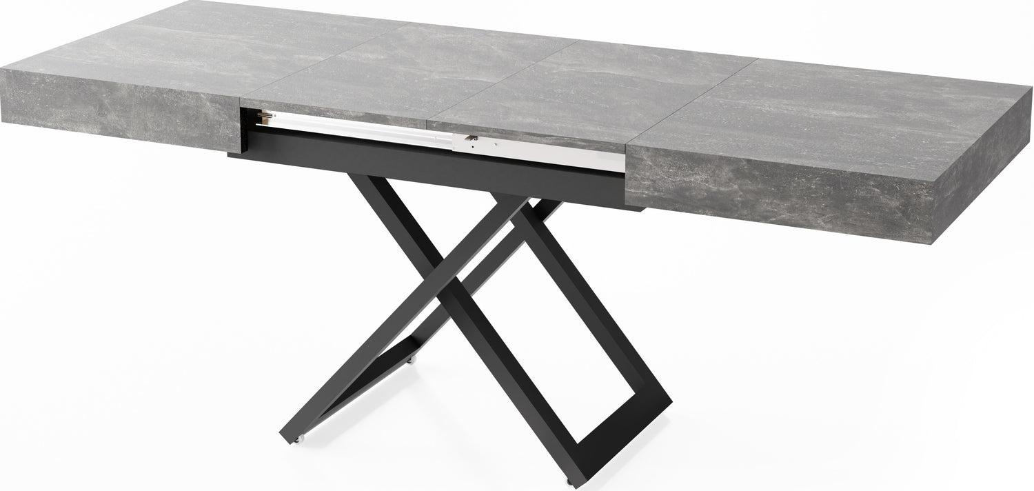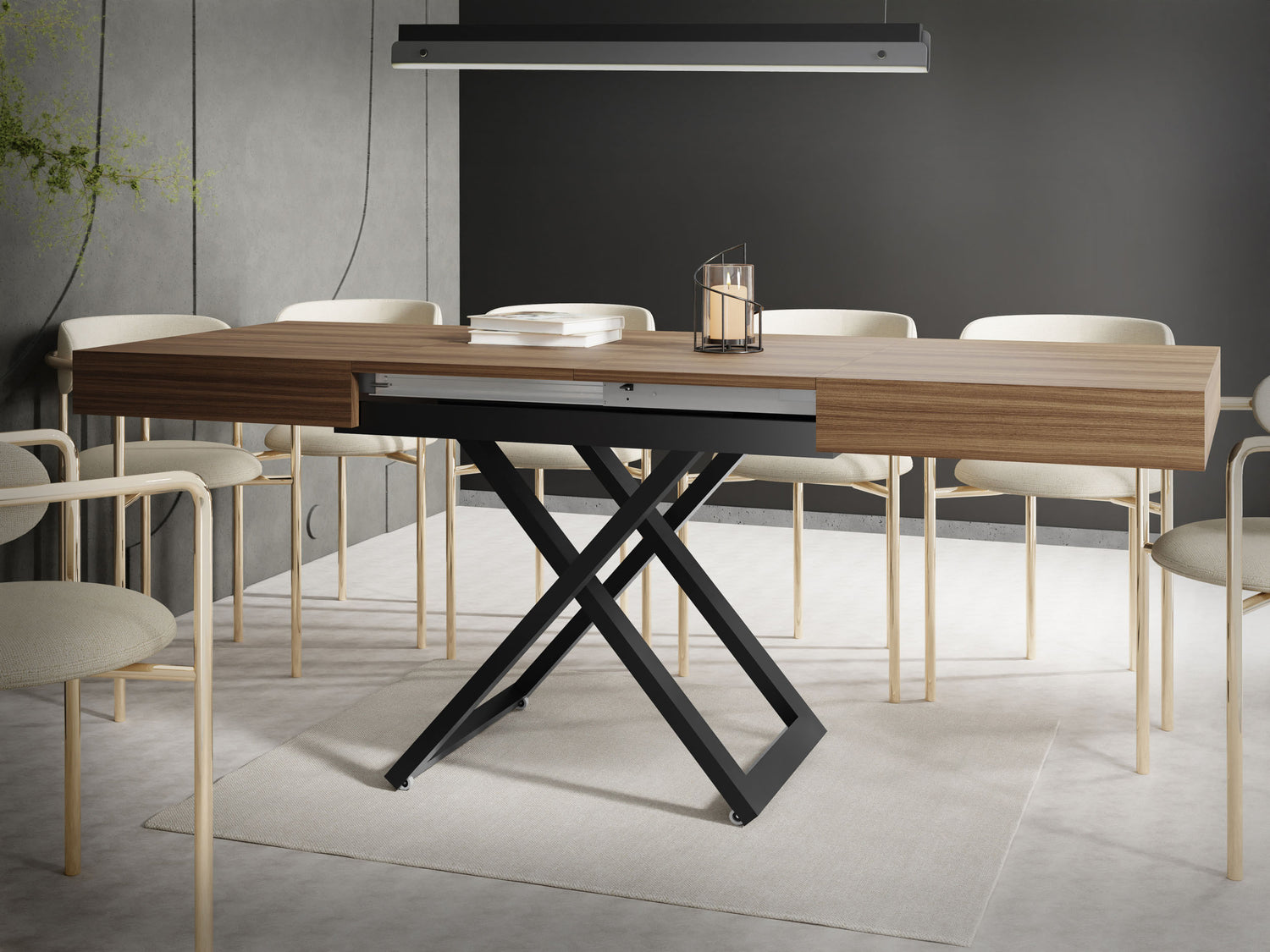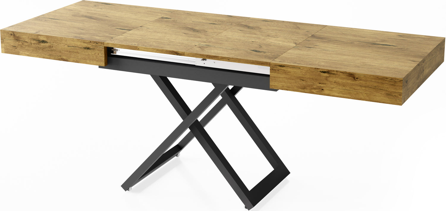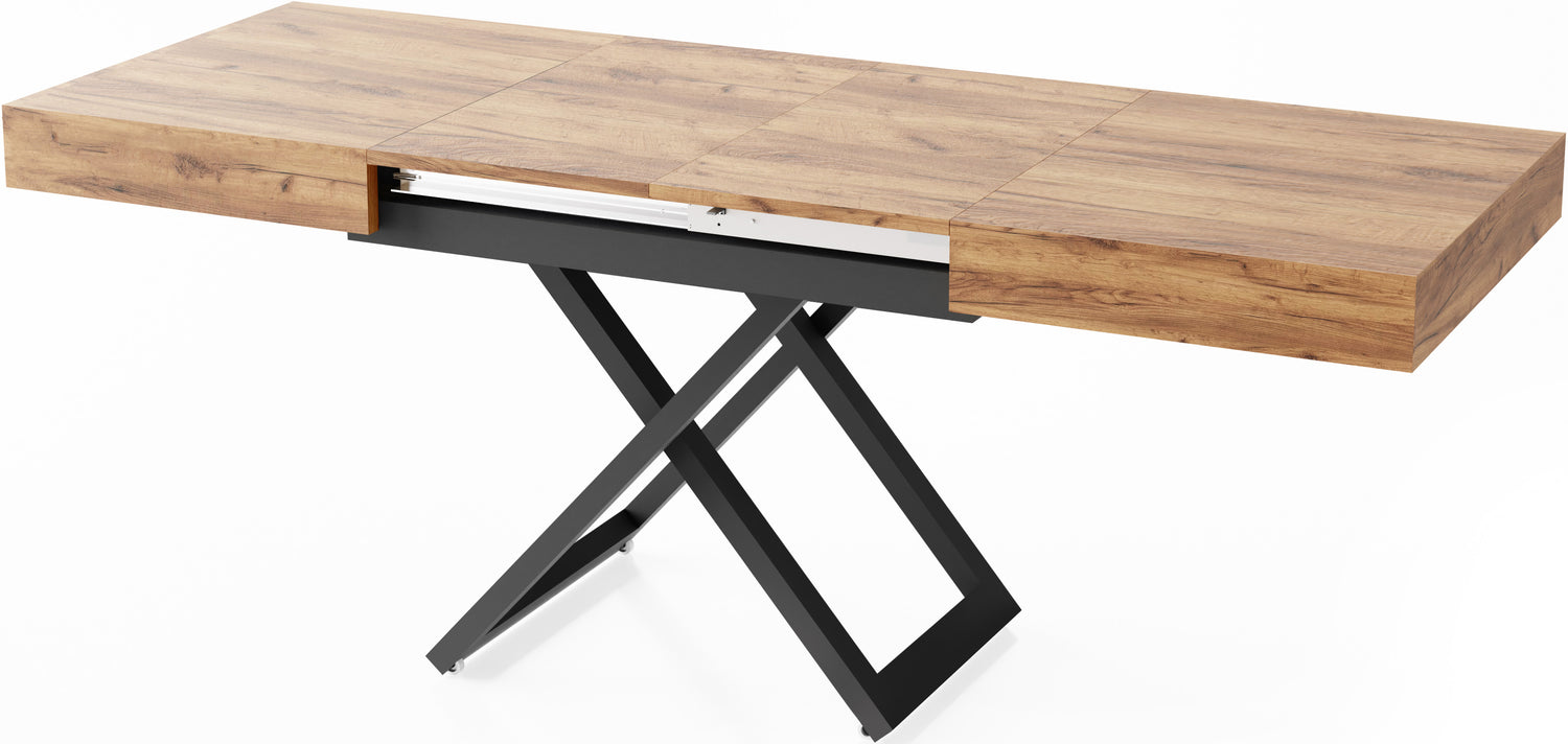 Płynna regulacja wysokości od 27 do 76 cm pozwala dostosować mebel do każdej sytuacji: rano jako kompaktowy stolik kawowy, wieczorem jako przestronny stół jadalniany dla nawet 8 osób. Blat można rozszerzyć z 120 do 200 cm dzięki dwóm wbudowanym wkładkom – idealne rozwiązanie na spotkania rodzinne i dla niezapowiedzianych gości.