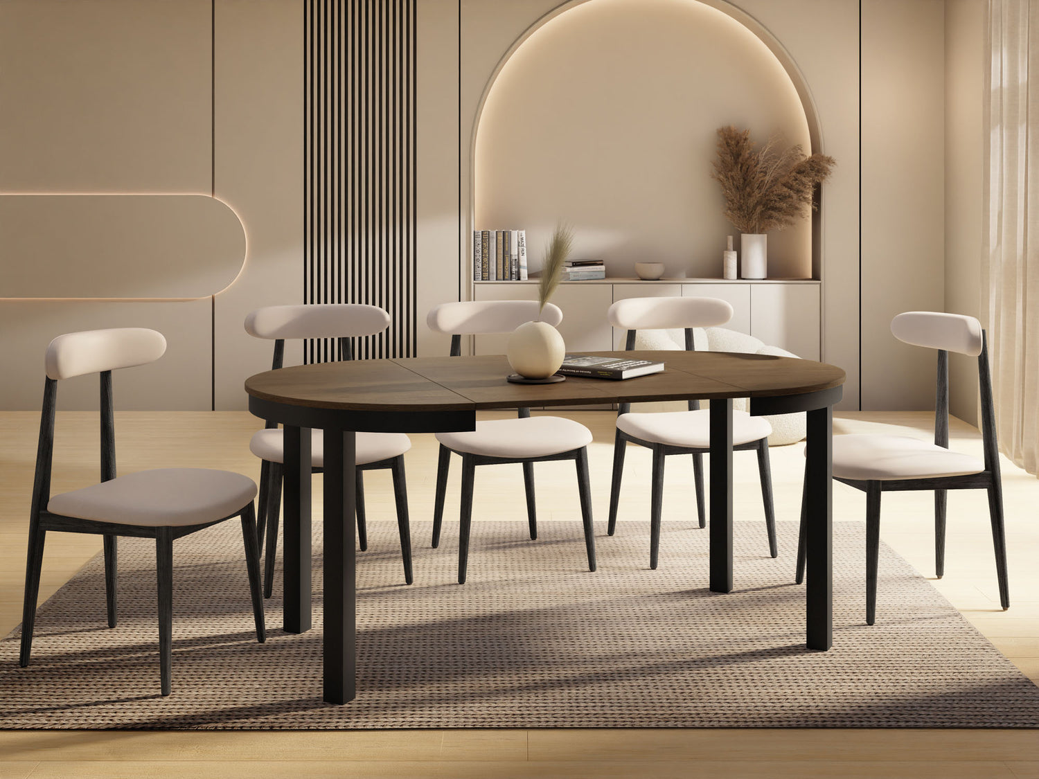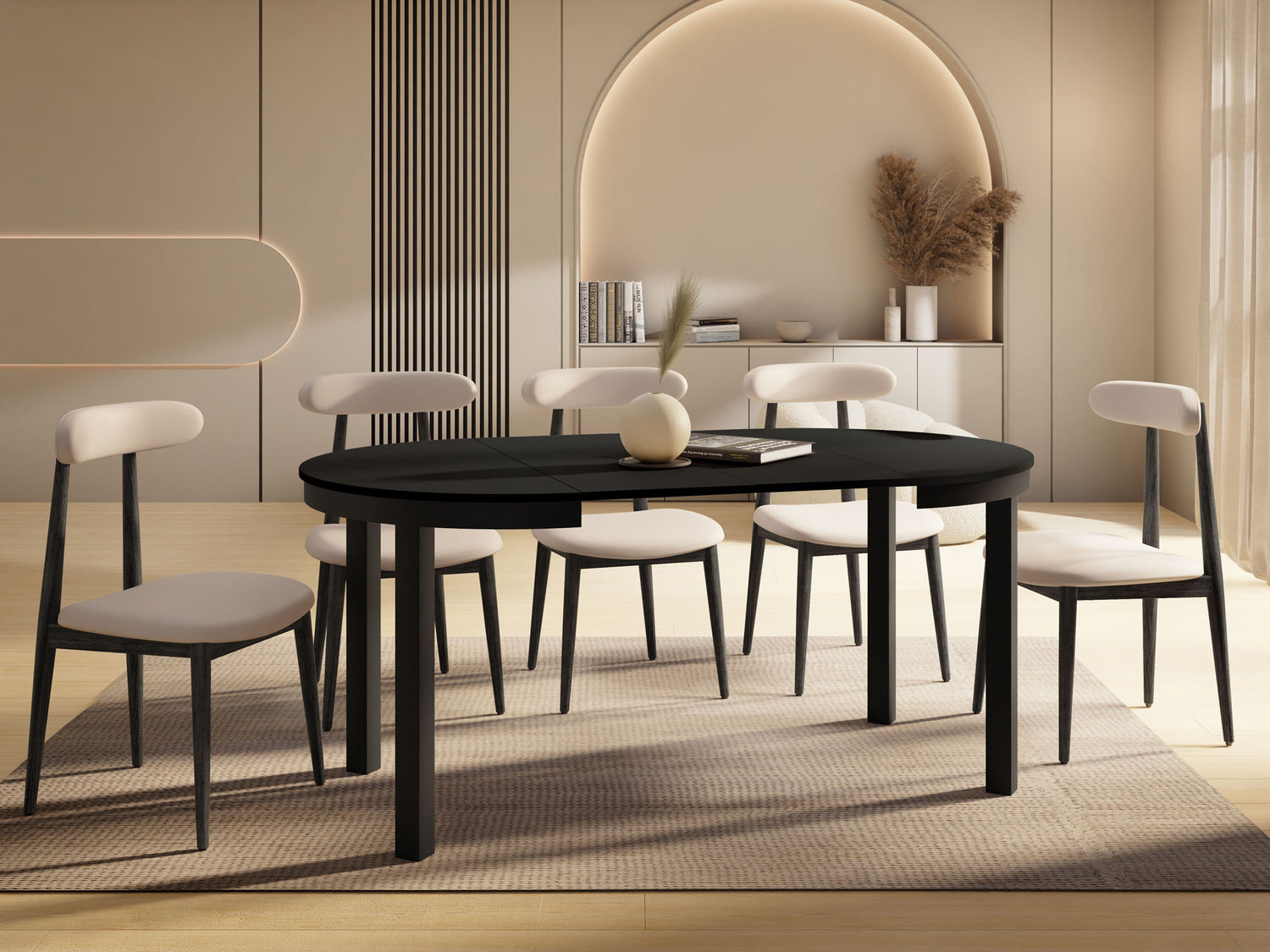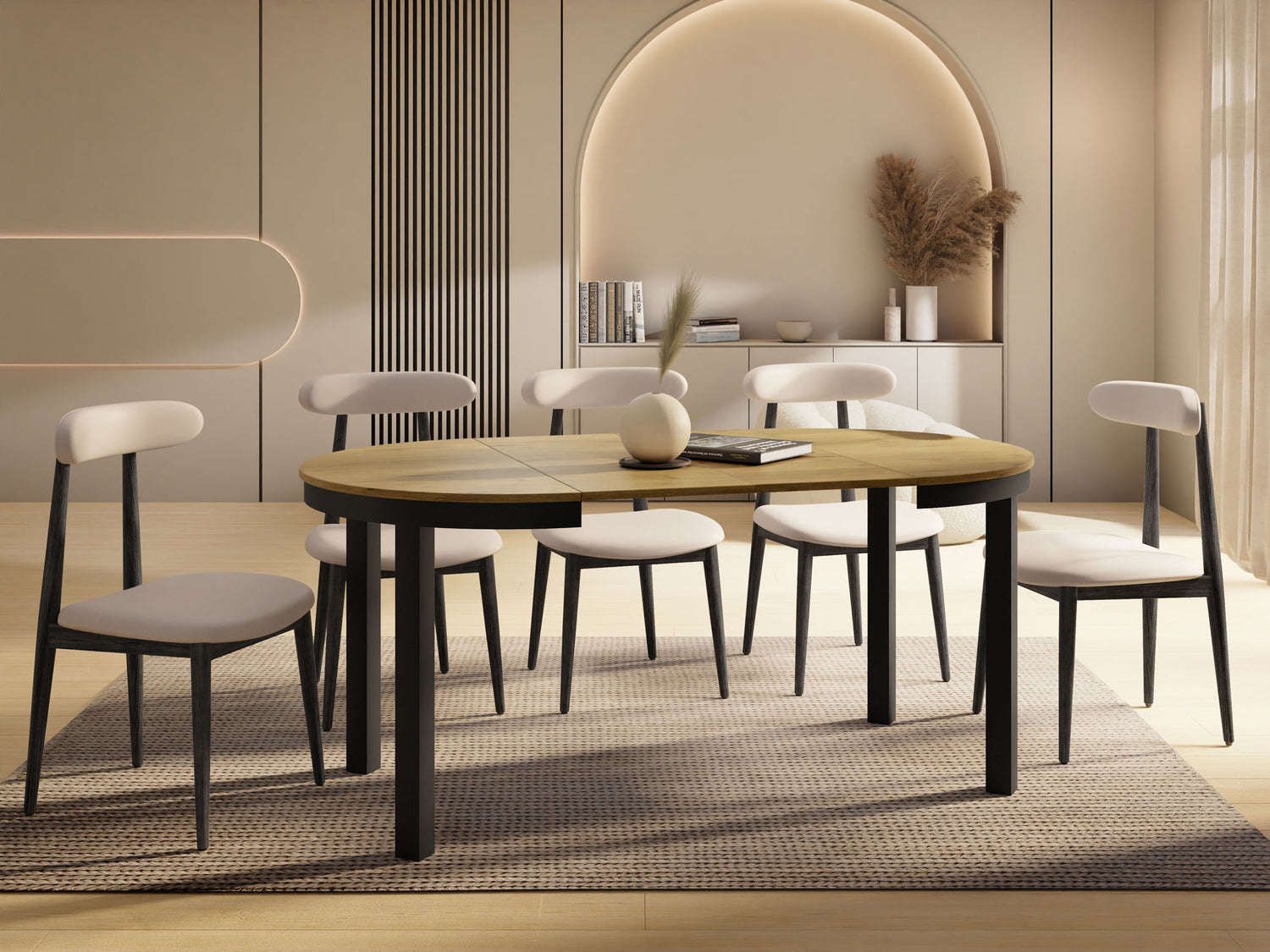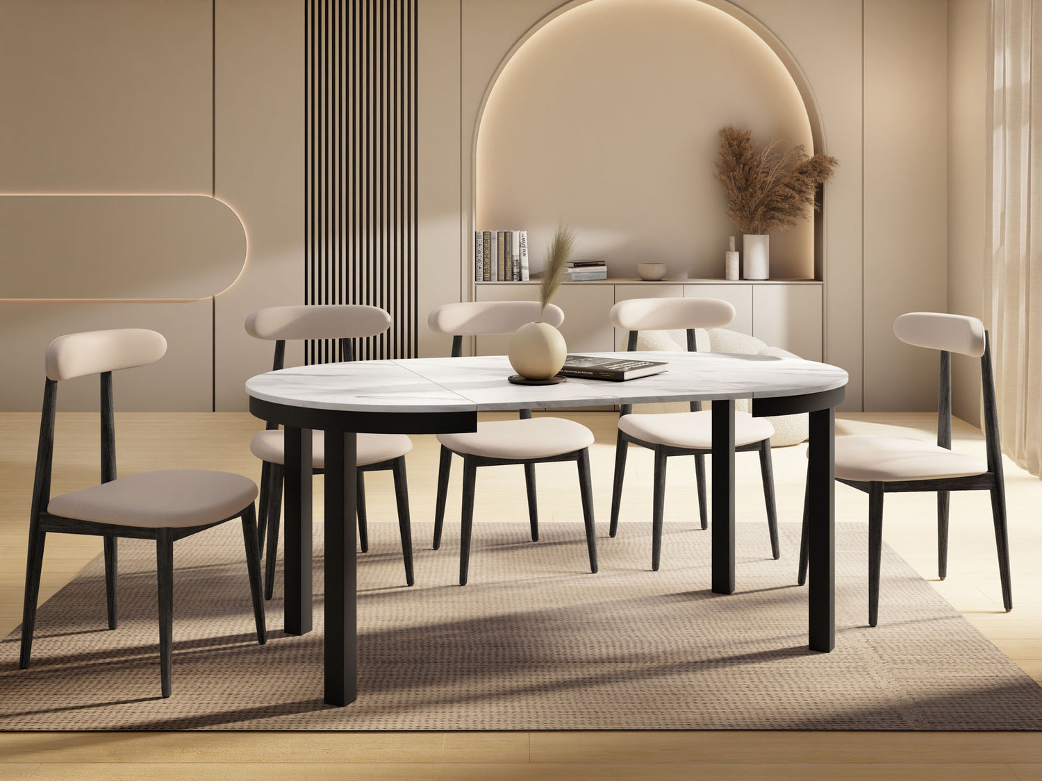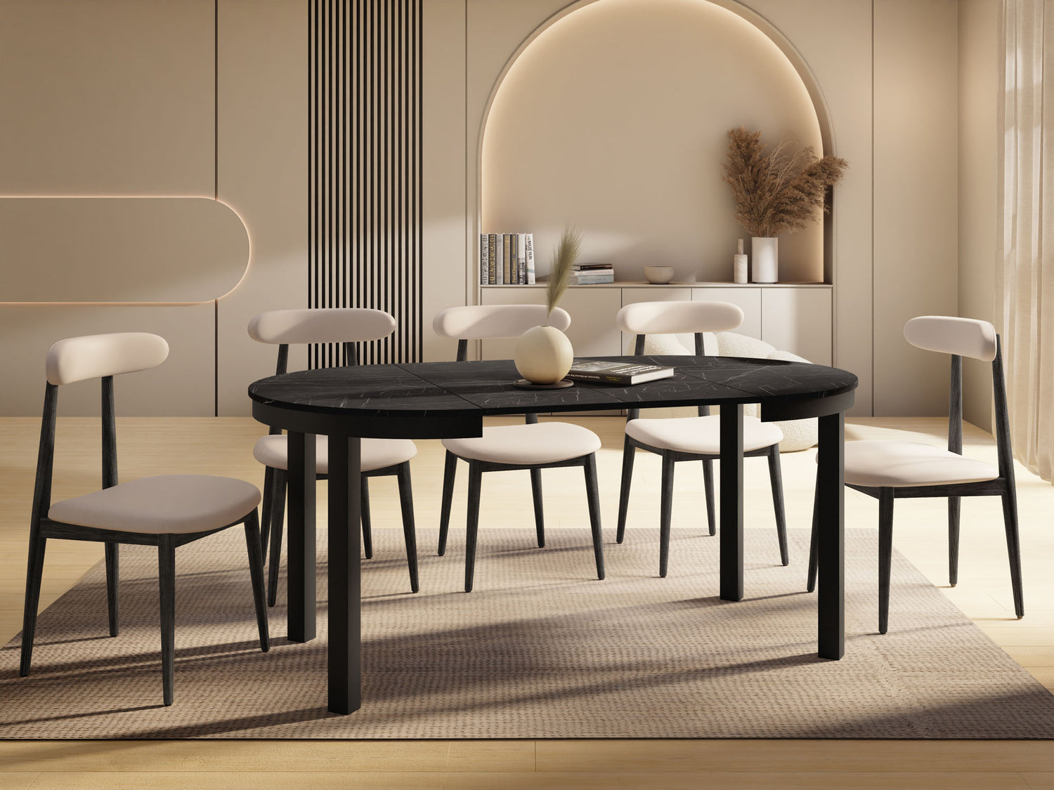 Stół jadalniany Corin to elegancki, okrągły stół zaprojektowany z myślą o nowoczesnych wnętrzach. Jego minimalistyczna forma, stabilna metalowa podstawa i funkcja rozkładania sprawiają, że Corin jest idealnym wyborem zarówno do codziennych posiłków, jak i większych spotkań w gronie rodziny i przyjaciół.
