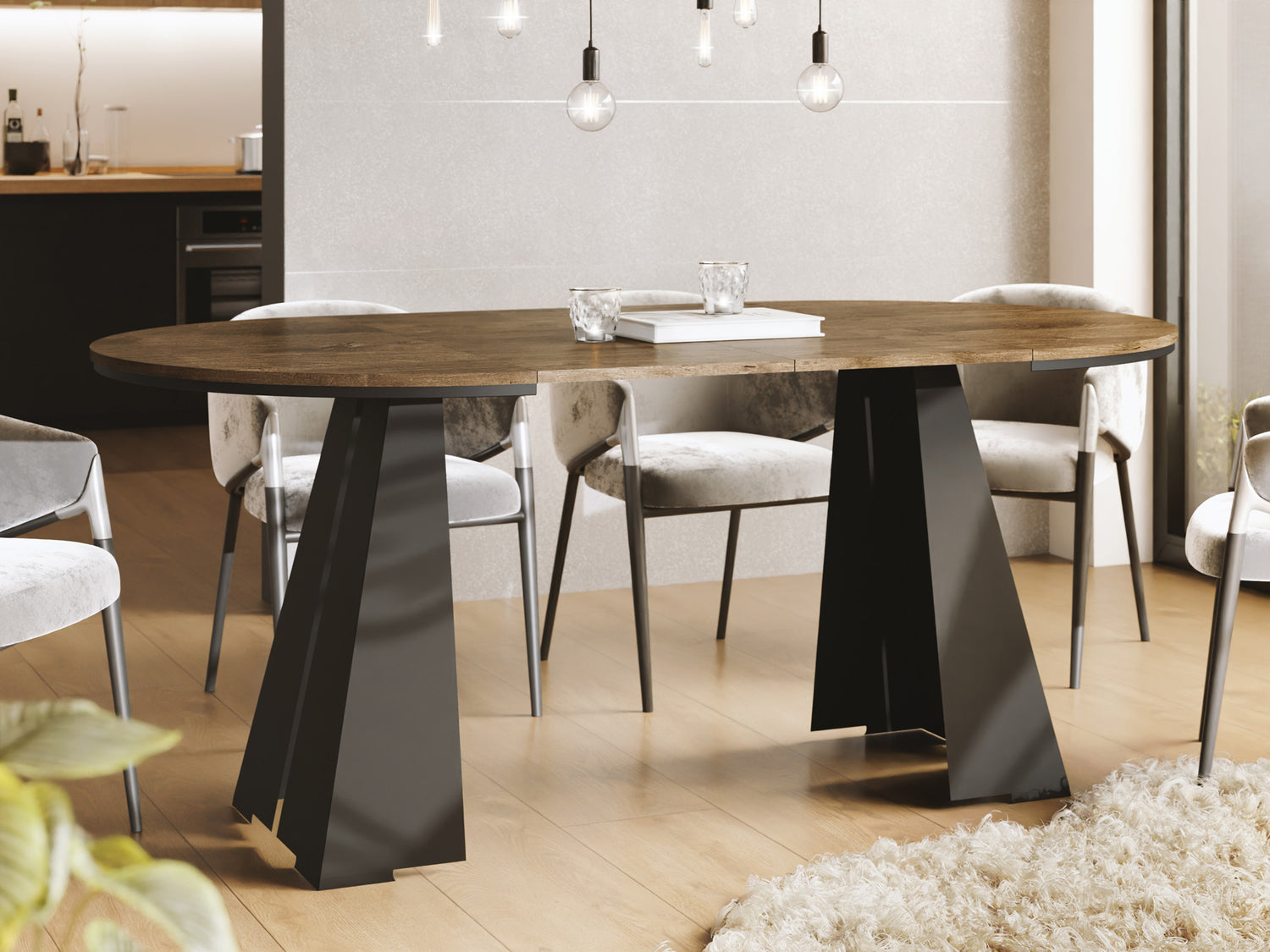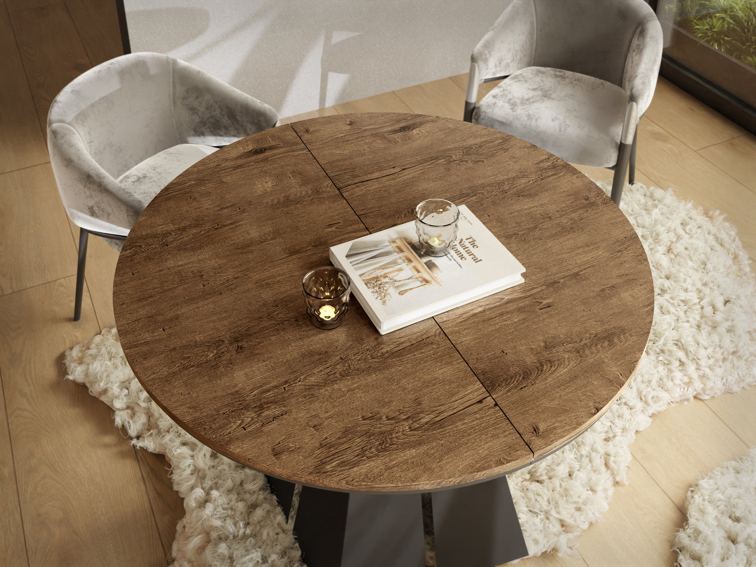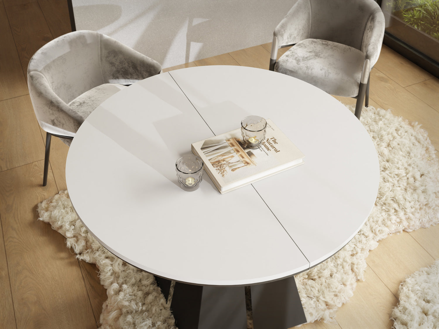 Stół jadalniany Kova łączy nowoczesny design z architektoniczną formą. Charakterystyczna podstawa w kształcie piramidy nadaje mu wyjątkowy, rzeźbiarski wygląd, a okrągły blat sprawia, że idealnie sprawdza się jako stylowe centrum jadalni lub salonu.