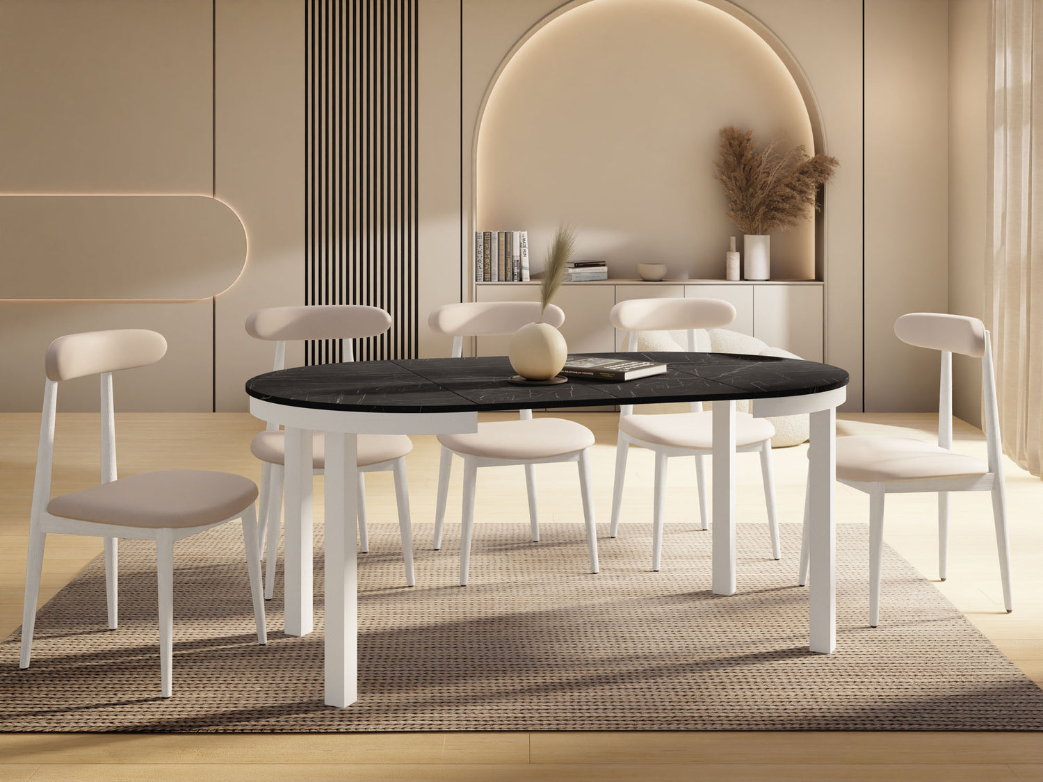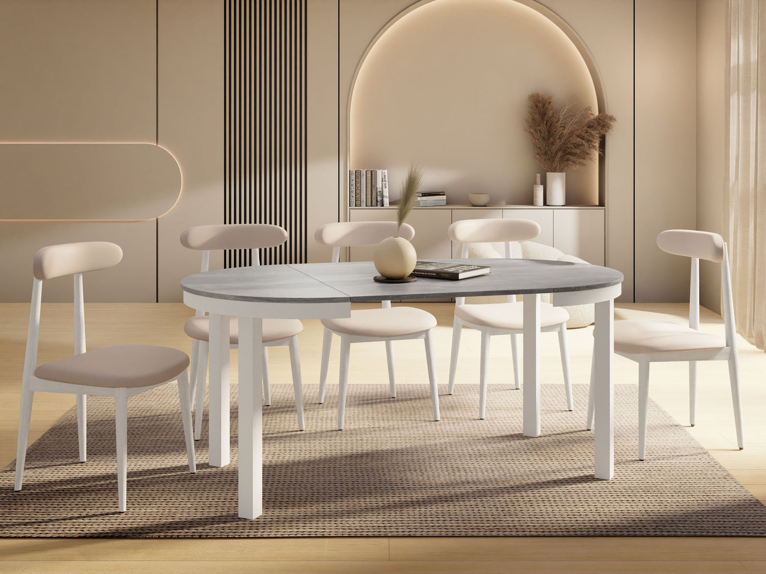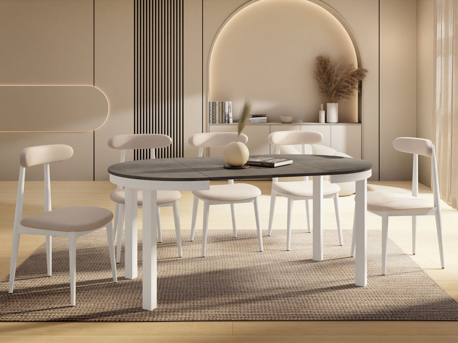 Stół jadalniany Corin to elegancki, okrągły stół zaprojektowany z myślą o nowoczesnych wnętrzach. Jego minimalistyczna forma, stabilna metalowa podstawa i funkcja rozkładania sprawiają, że Corin jest idealnym wyborem zarówno do codziennych posiłków, jak i większych spotkań w gronie rodziny i przyjaciół.
