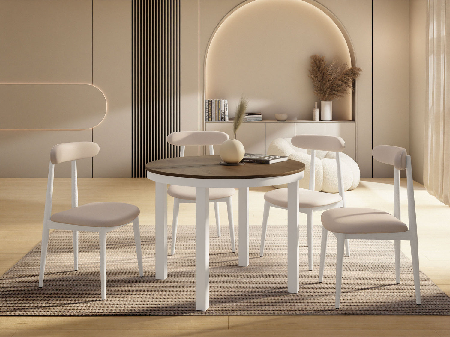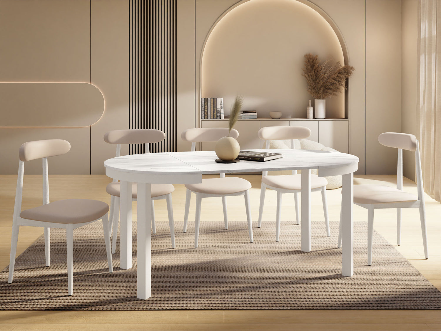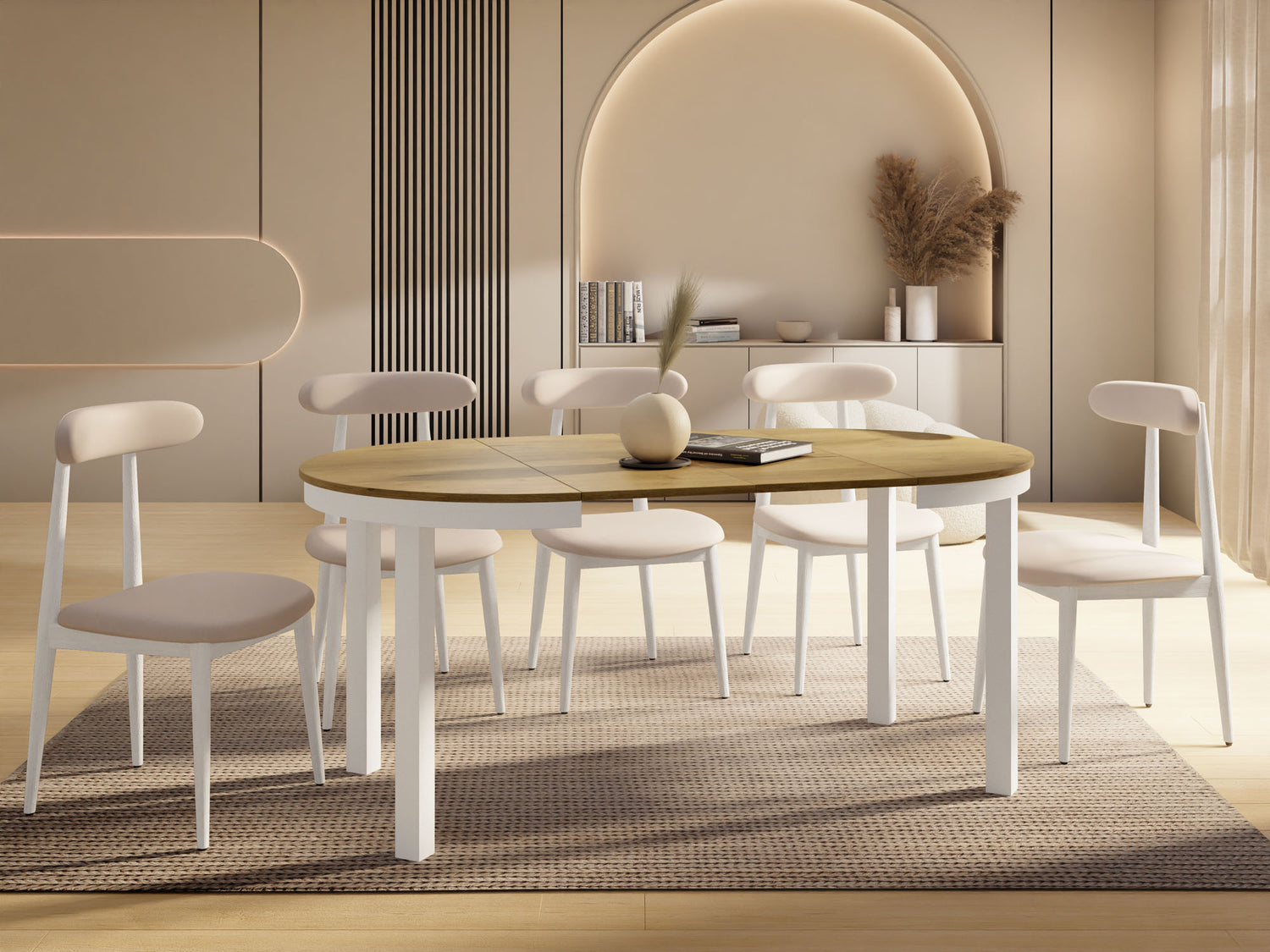 Stół jadalniany Corin to elegancki, okrągły stół zaprojektowany z myślą o nowoczesnych wnętrzach. Jego minimalistyczna forma, stabilna metalowa podstawa i funkcja rozkładania sprawiają, że Corin jest idealnym wyborem zarówno do codziennych posiłków, jak i większych spotkań w gronie rodziny i przyjaciół.