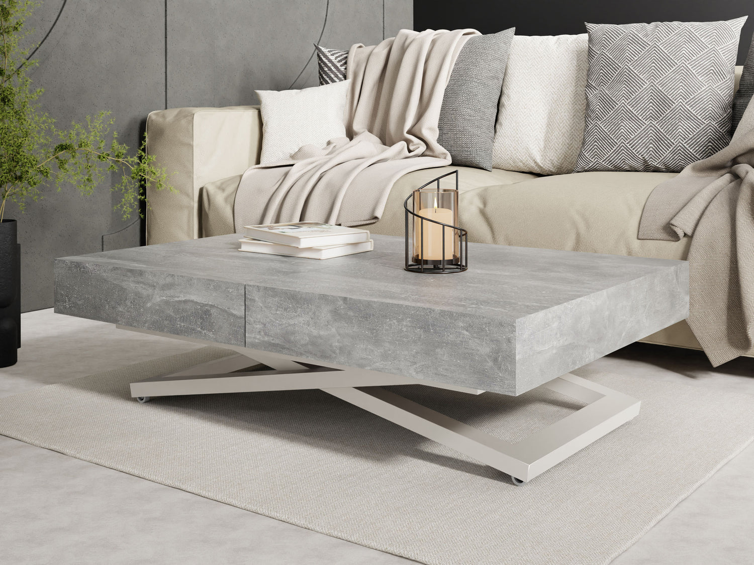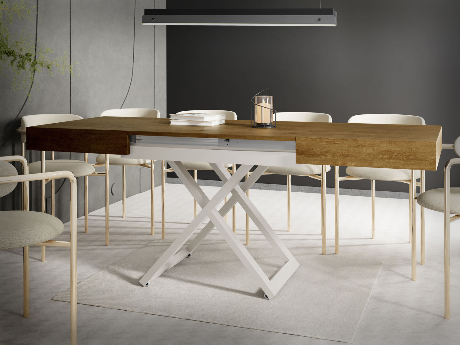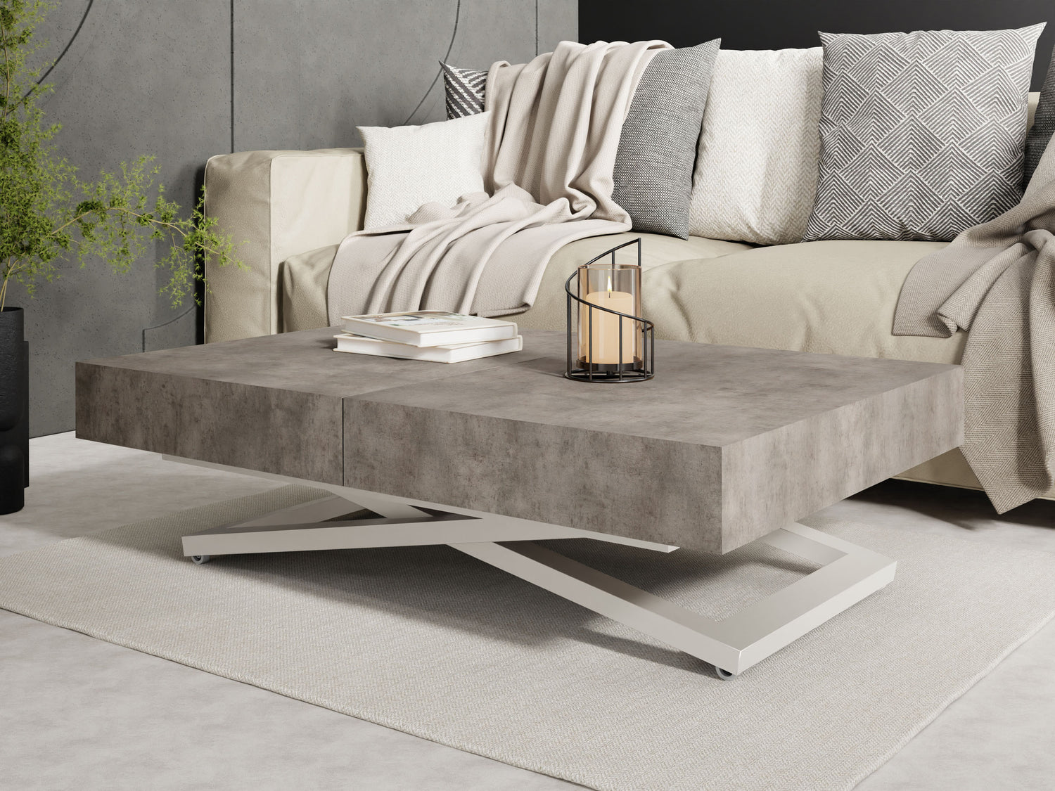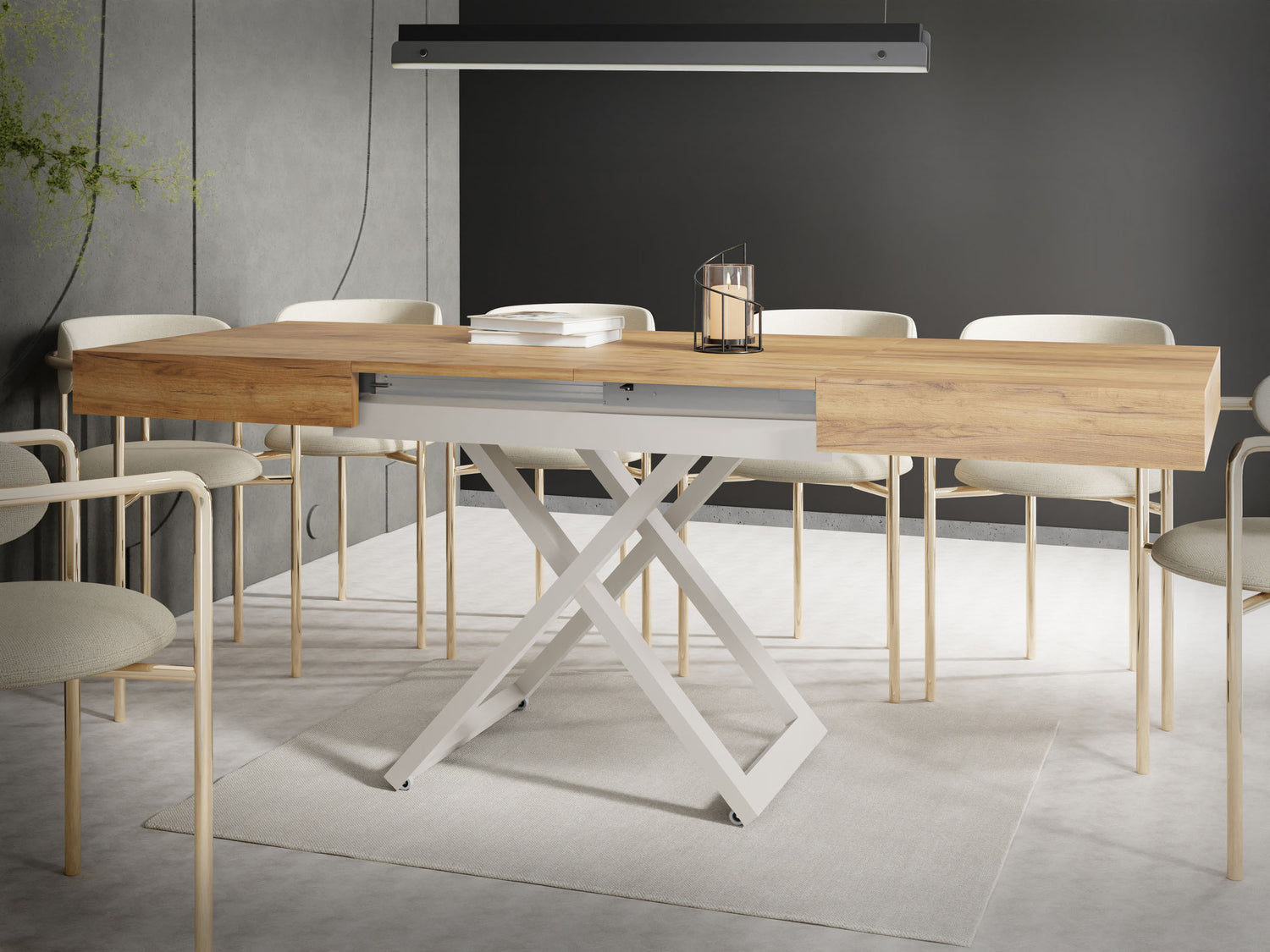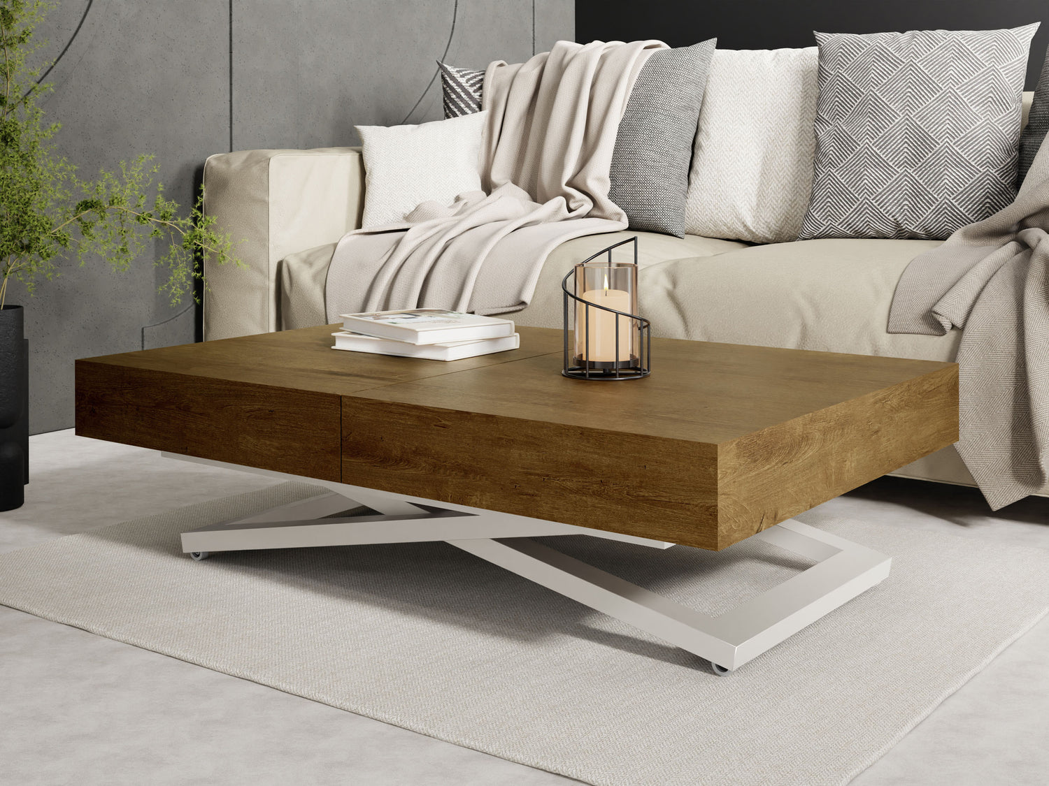 Szczególną cechą jest dopracowany system podnoszenia, który umożliwia płynną i stabilną regulację wysokości. Stół można przekształcić z wysokości stolika kawowego na wysokość stołu jadalnego za pomocą kilku prostych ruchów, oferując maksymalną stabilność w każdej pozycji.