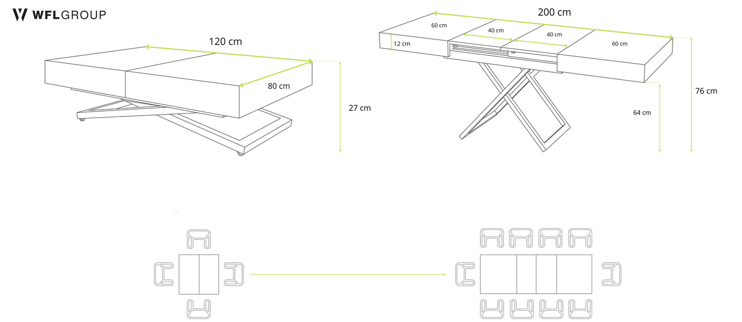 Innowacyjna regulacja wysokości od 27 do 76 cm umożliwia elastyczne użytkowanie: rano kompaktowy stolik kawowy, wieczorem przestronny stół jadalny dla maksymalnie 8 osób. Blat można rozszerzyć z 120 do 200 cm za pomocą dwóch wbudowanych płyt dodatkowych - idealny na niespodziewanych gości lub spotkania rodzinne.