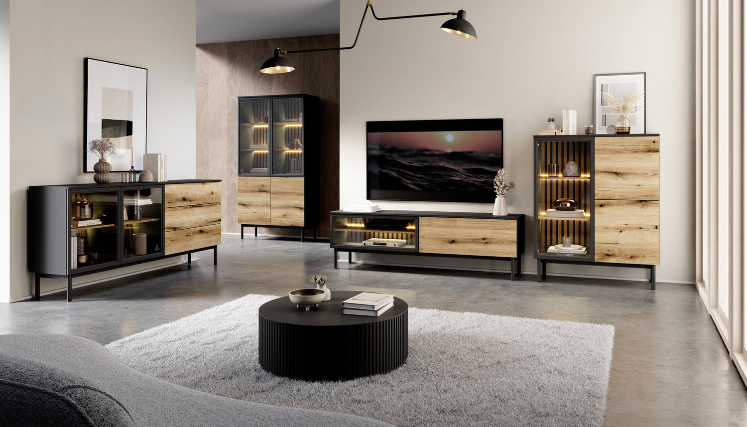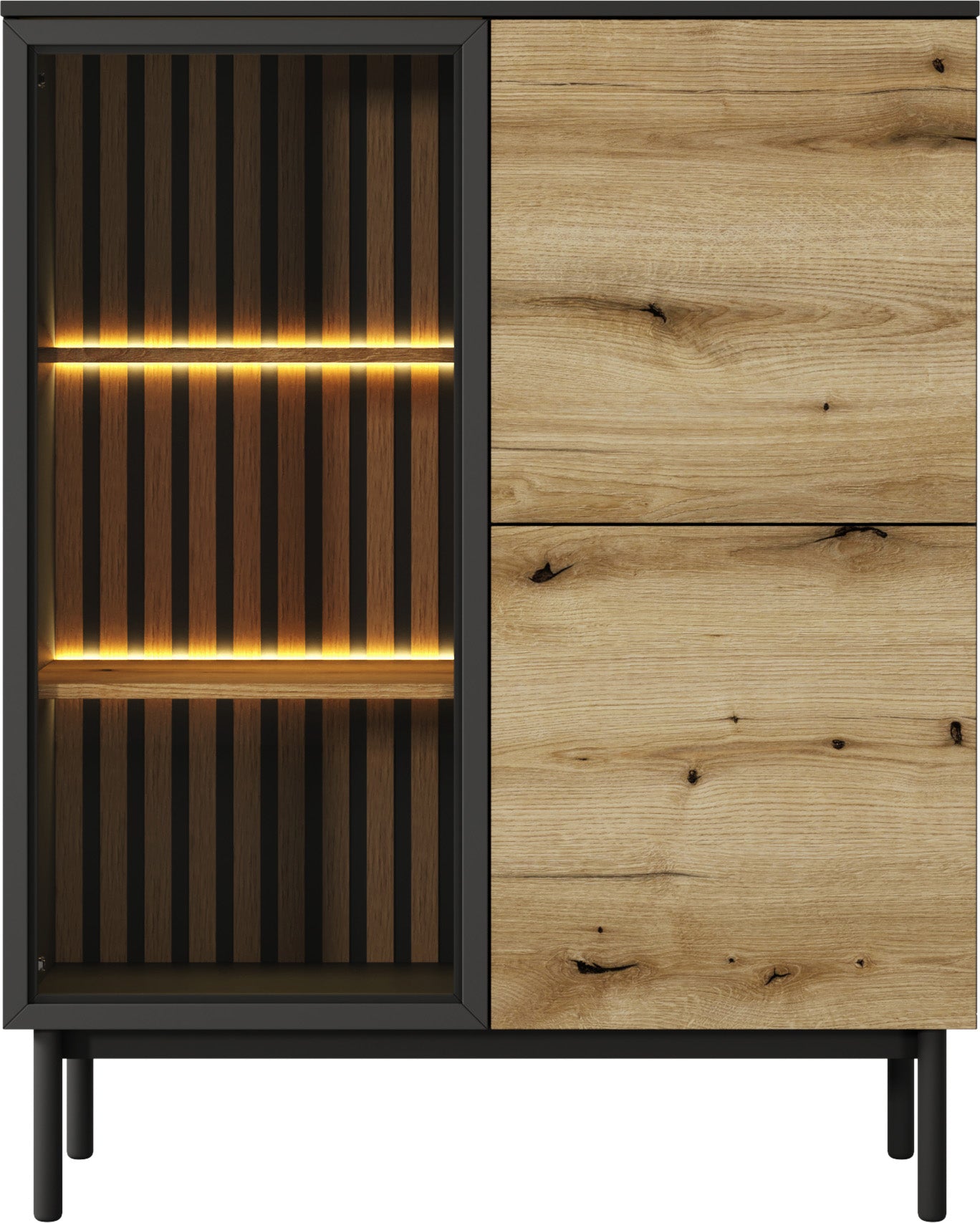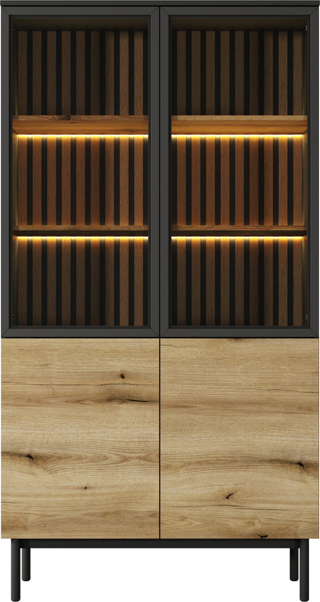 Witryny z kolekcji Holmric łączą nowoczesny design z wyrazistymi, eleganckimi materiałami. To idealny wybór do stylowych wnętrz, w których liczy się charakter i dopracowana estetyka. Połączenie matowego, czarnego korpusu, lameli w dekorze Dąb Evoke oraz frontów z hartowanego szkła w czarnych ramach MDF tworzy efektowny, kontrastowy wygląd.